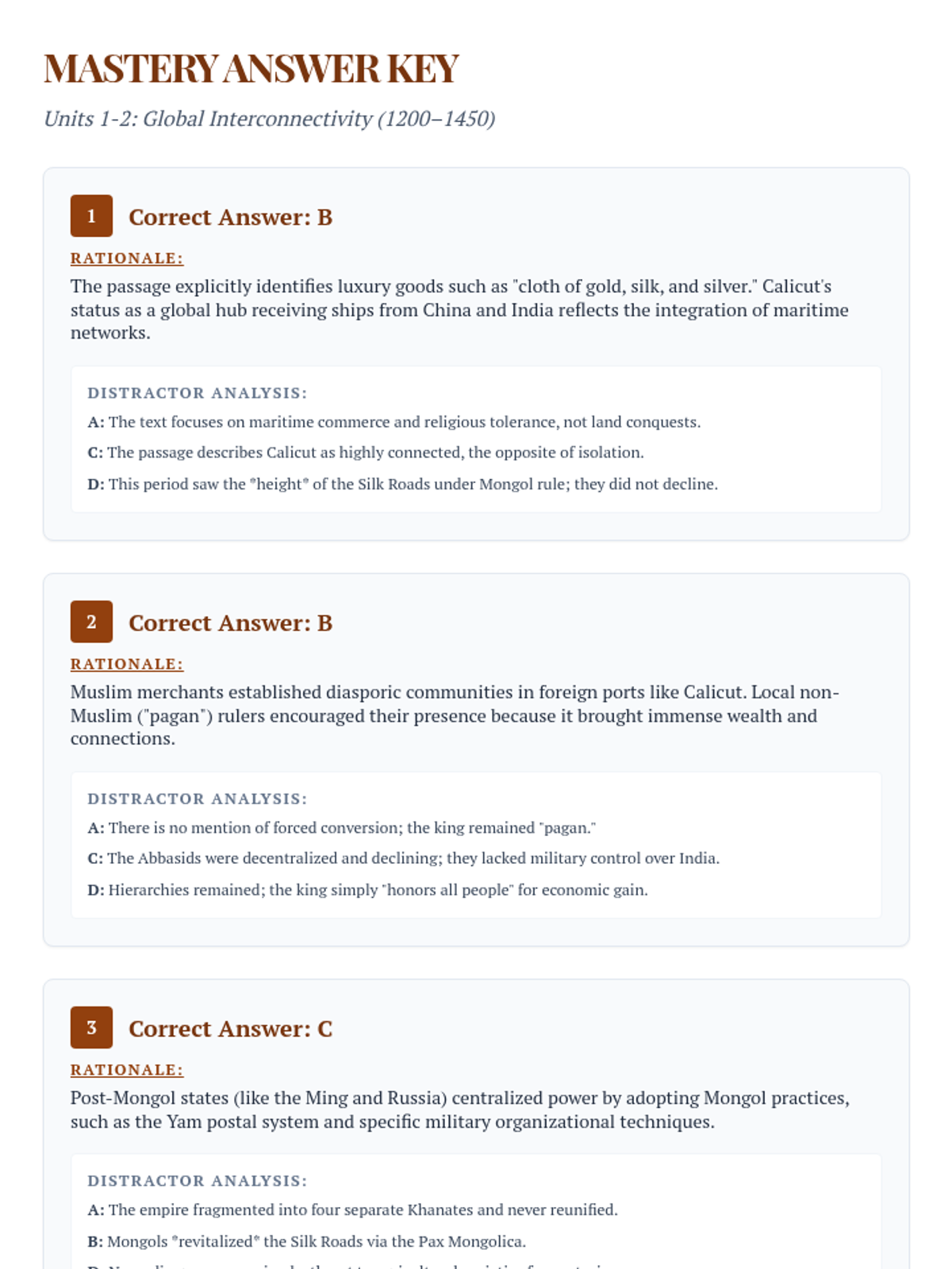 Consolidated answer key for the Units 1-2 (1200-1450) MCQ set, covering 10 questions with rationales.