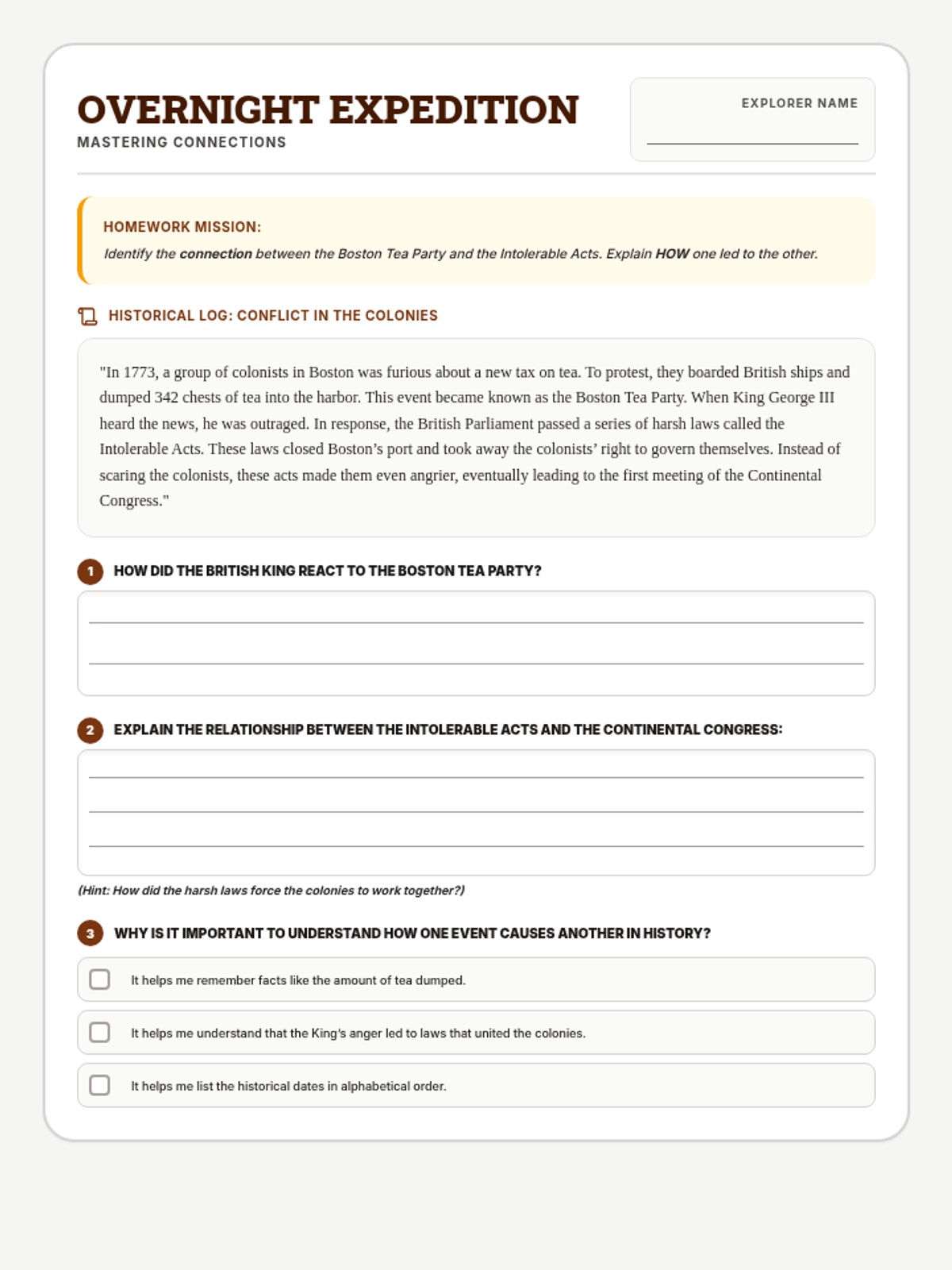 A social studies integrated homework assignment for 4th grade, focusing on the Boston Tea Party and the Intolerable Acts. Space provided for explaining causal relationships between historical events. (Revised for layout and clarity).