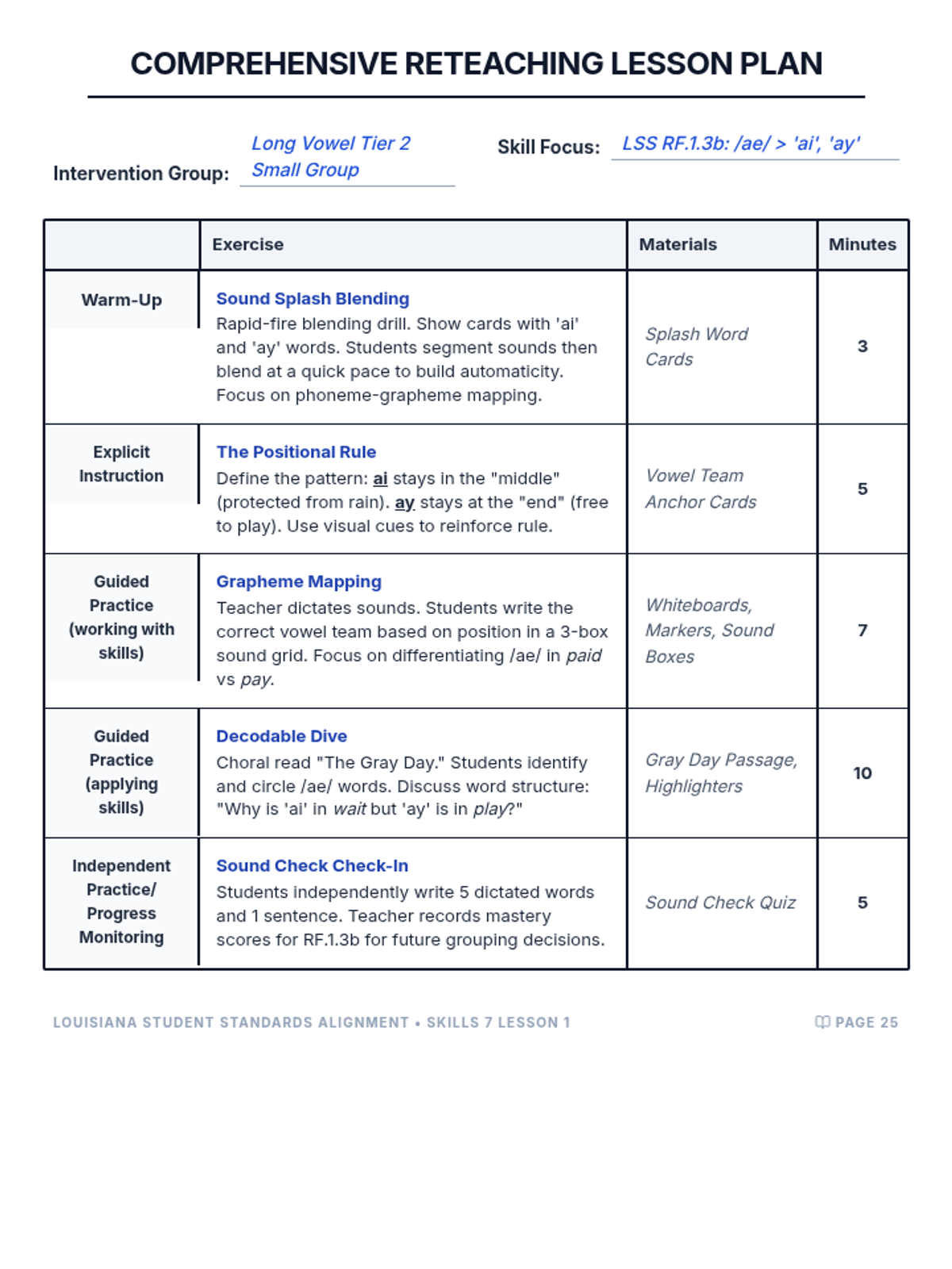A structured reteaching lesson plan for 'ai' and 'ay' vowel teams, formatted according to the Comprehensive Reteaching Lesson Plan Template for 30-minute small group intervention.