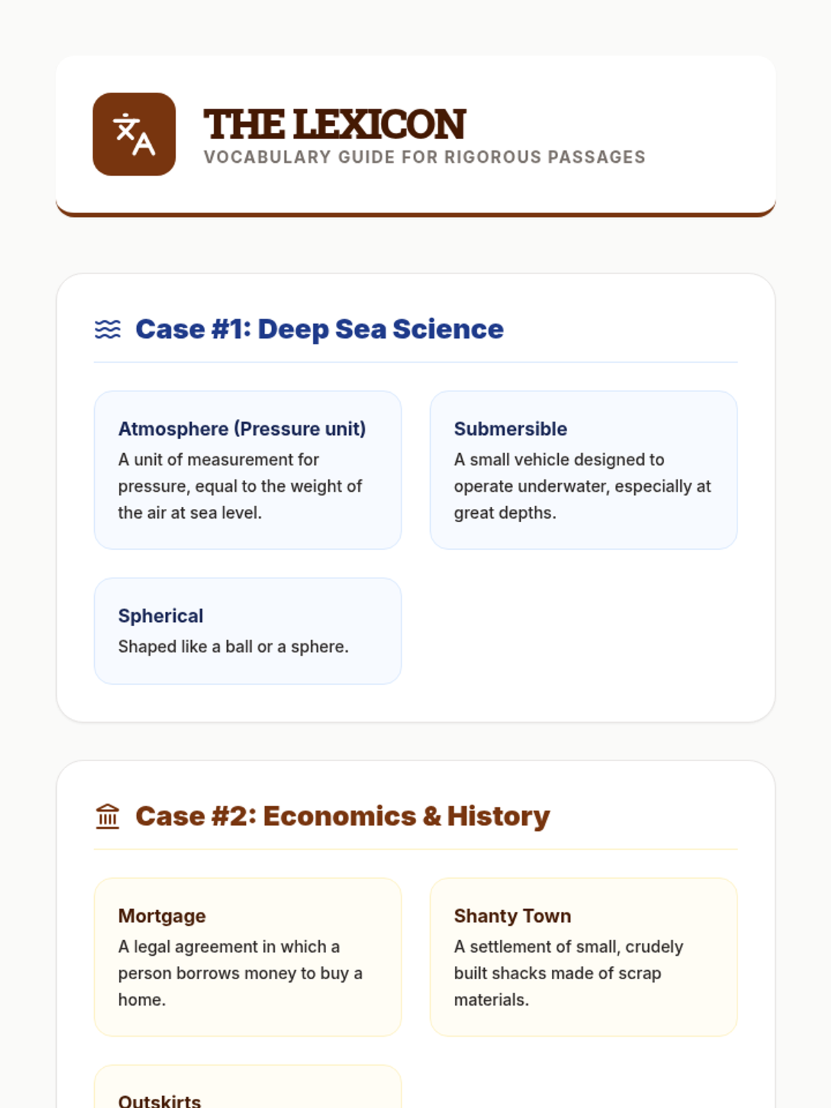 A comprehensive vocabulary key for all five rigorous connection passages, featuring clear definitions for 4th-grade science and social studies terms. Organized by case file for teacher reference. (Revised for layout and page breaks).