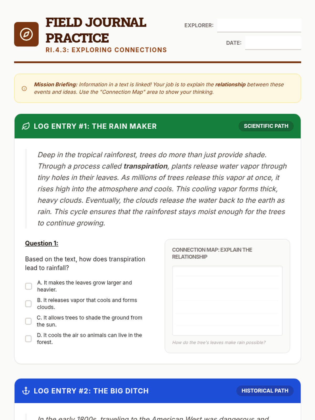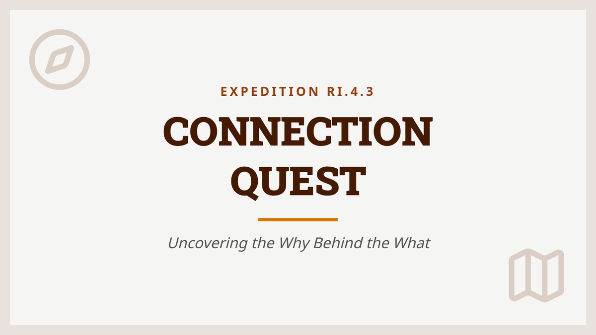 A highly visual slide deck for a 4th grade RI.4.3 reteach lesson, using a 'Connection Quest' explorer theme. Includes science-integrated guided practice and clear definitions of historical, scientific, and technical connections.