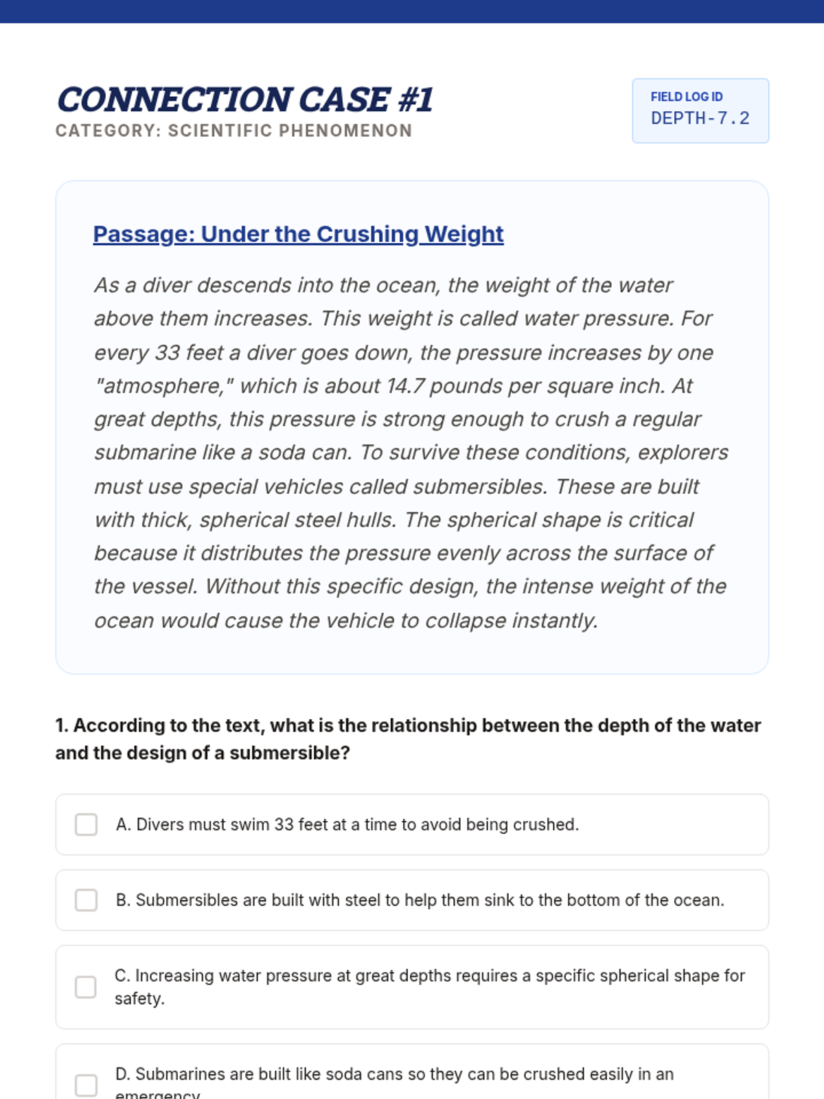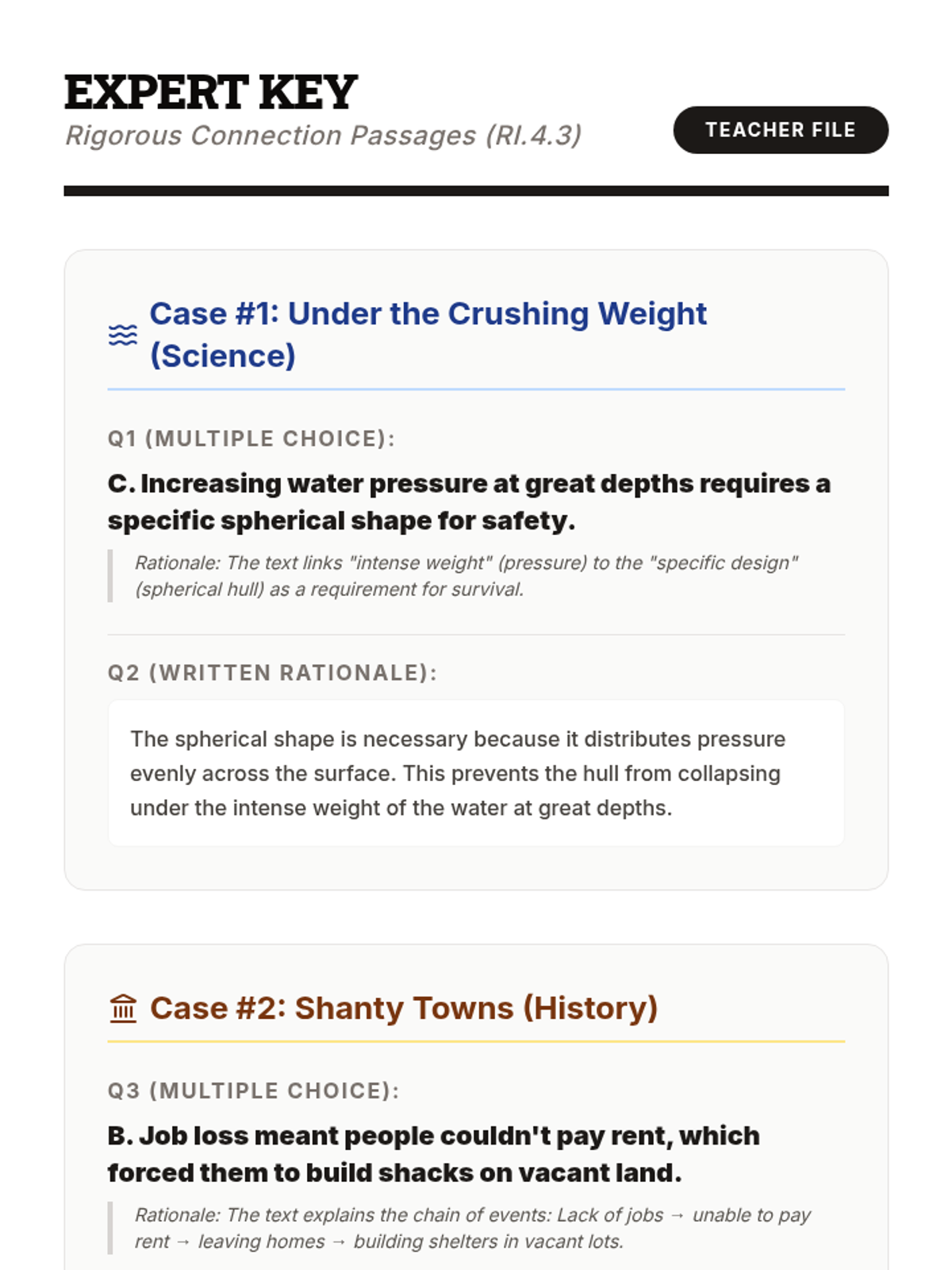 Teacher's answer key for the rigorous connection passages, including correct answers and specific rationale for each question. (Revised for layout and clarity).
