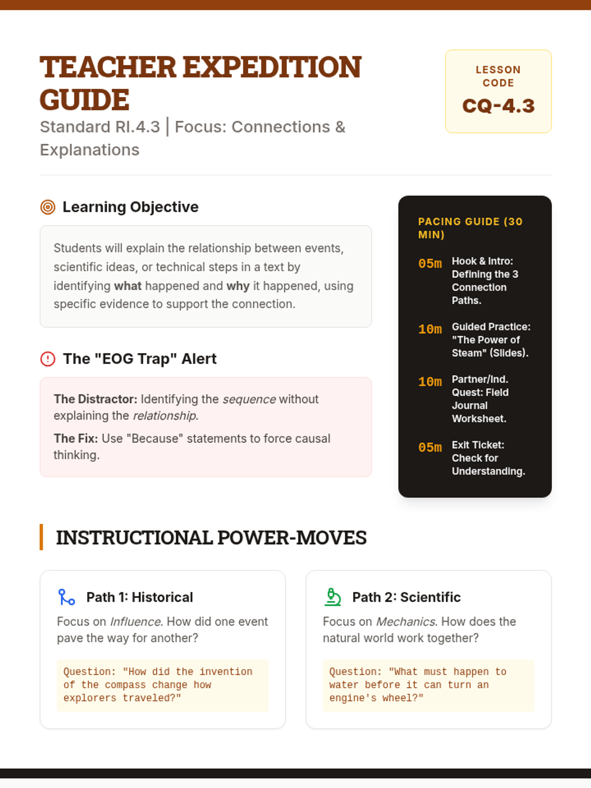 A comprehensive teacher guide for a 4th grade RI.4.3 reteach lesson, including standard breakdown, EOG trap alerts, questioning strategies, and differentiation tips. (Revised for layout and clarity).