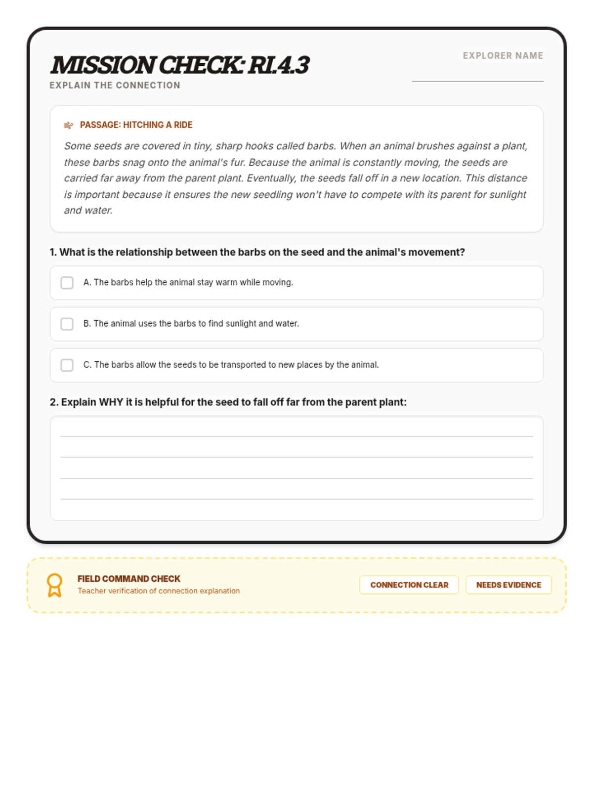 A high-impact exit ticket for 4th grade RI.4.3 reteach, using a seed dispersal passage with science integration and EOG-style questions. (Revised for layout and clarity).