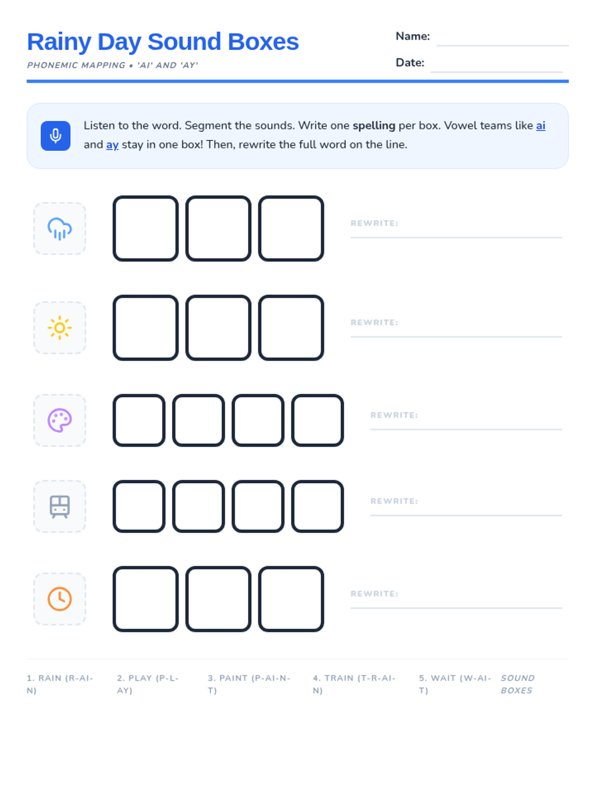 A phoneme-grapheme mapping worksheet featuring Elkonin boxes for 'ai' and 'ay' words, including 3-box and 4-box sets with visual icon cues and a teacher word bank. Fixed page break and improved layout.
