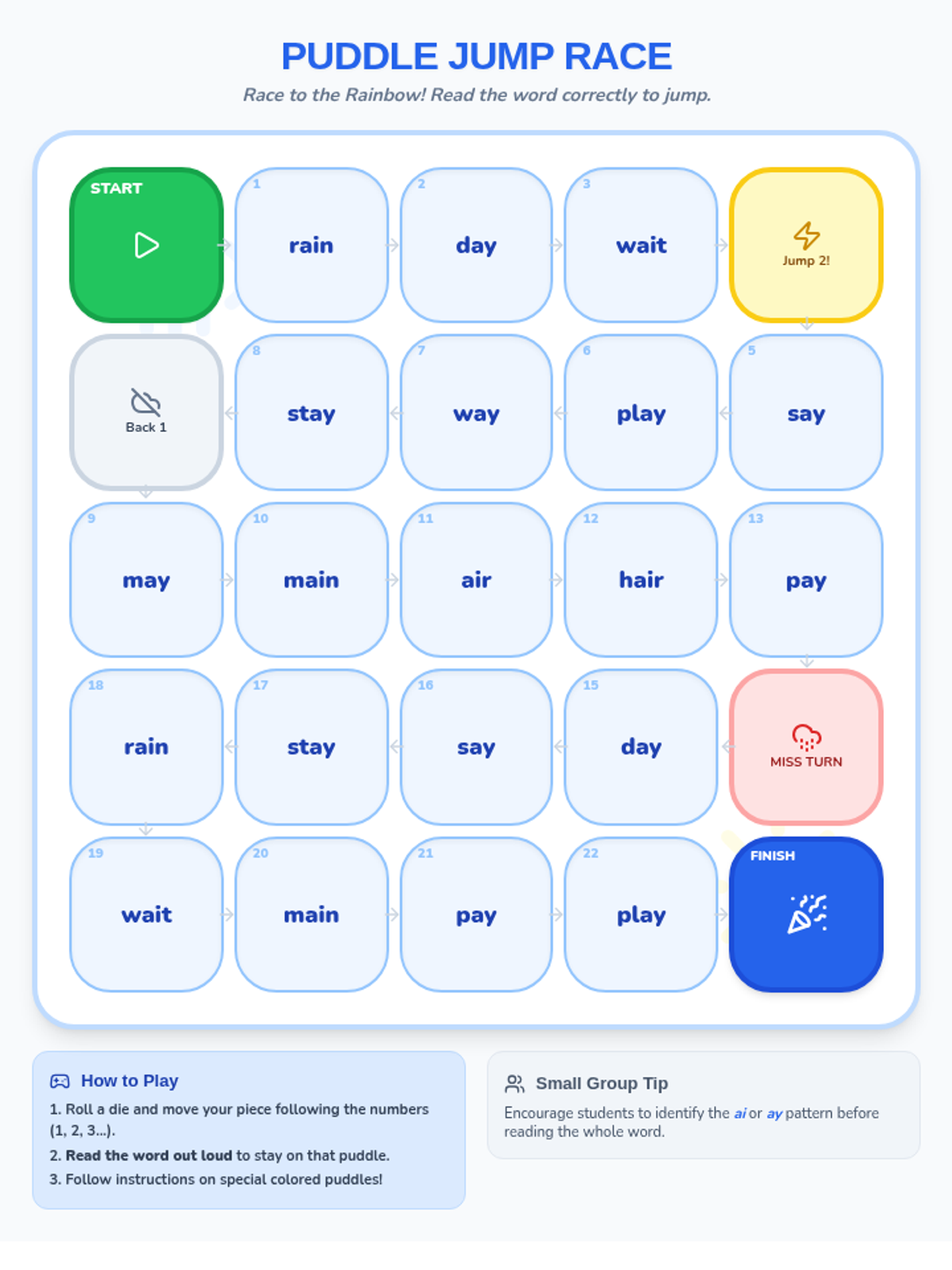 An engaging 'Puddle Jump Race' game board featuring 'ai' and 'ay' words, designed for small group fluency practice with fun rainy-day themed challenges.