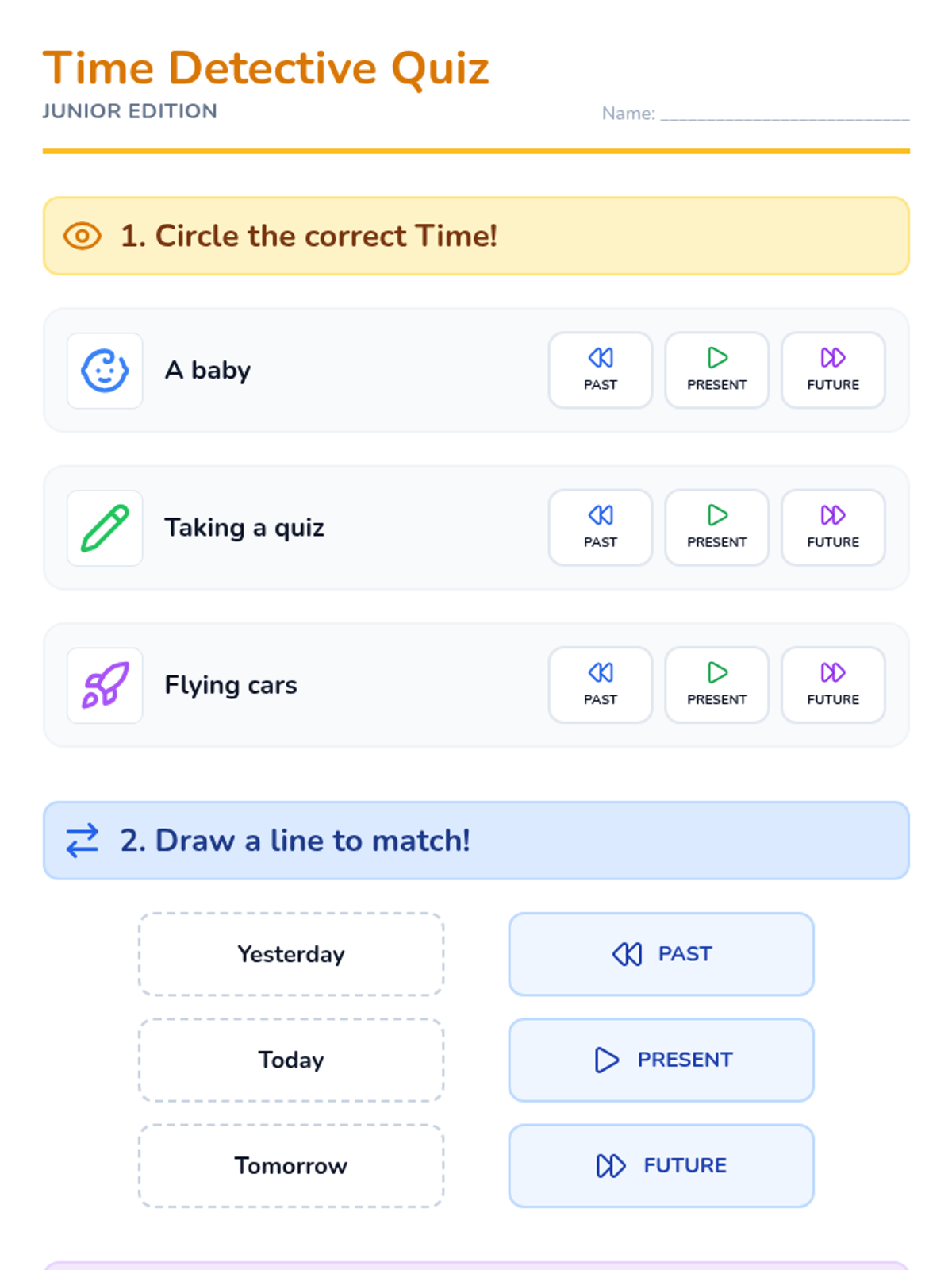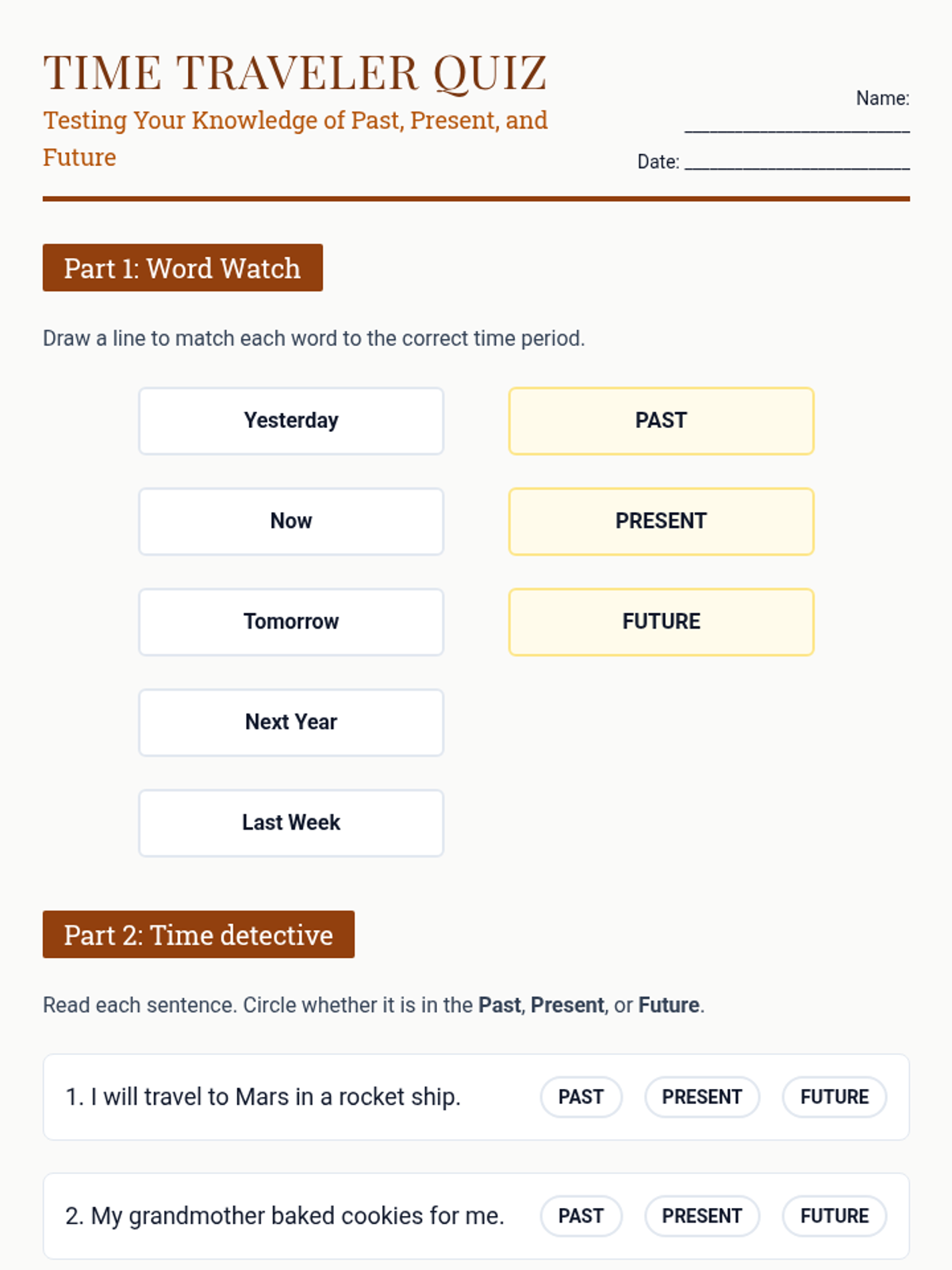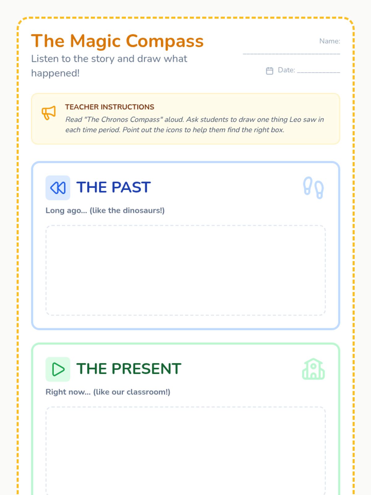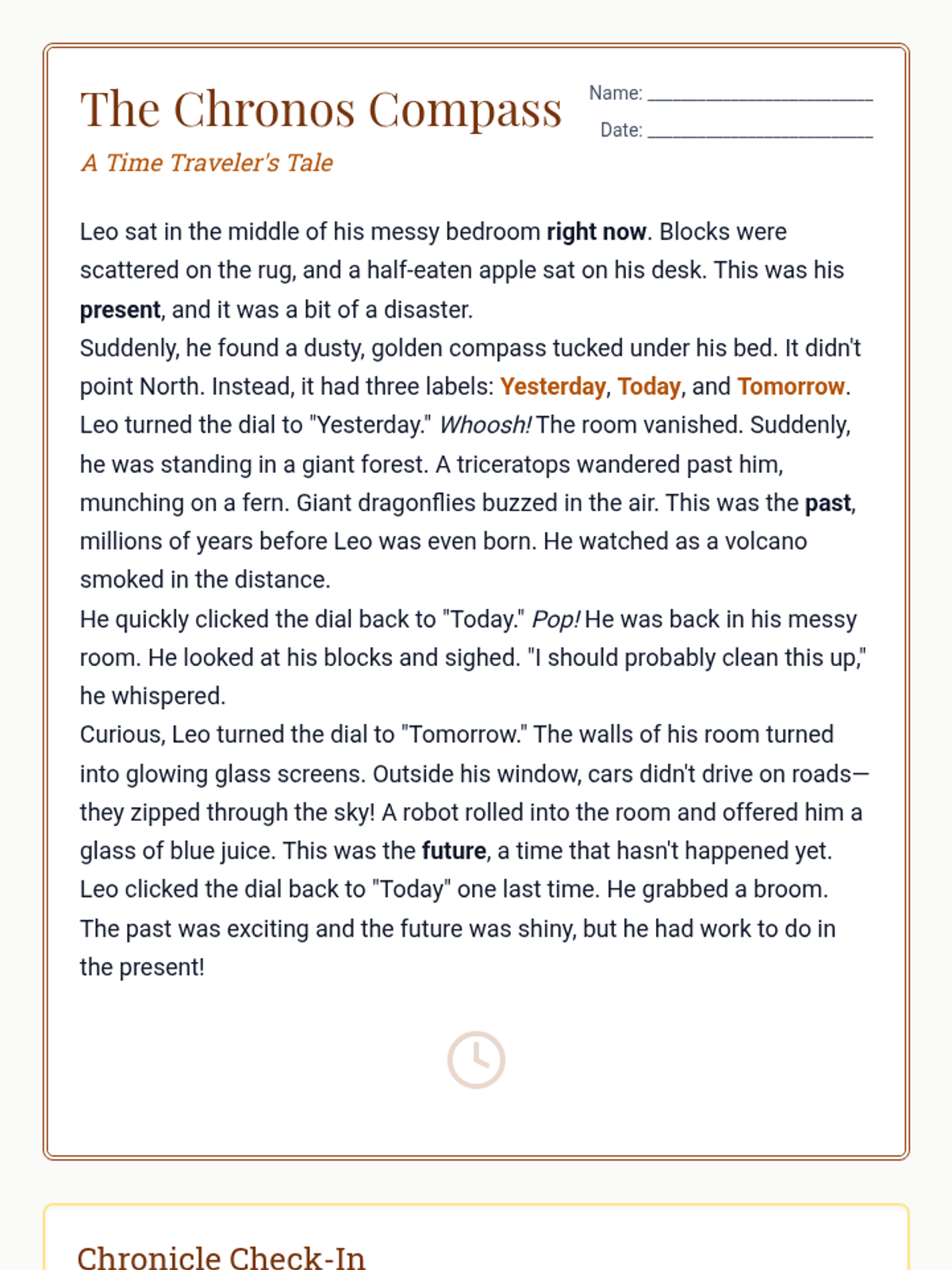A short story about a boy named Leo who discovers a time-traveling compass, helping students visualize the differences between the past, present, and future through narrative. Includes comprehension questions to reinforce the temporal concepts.