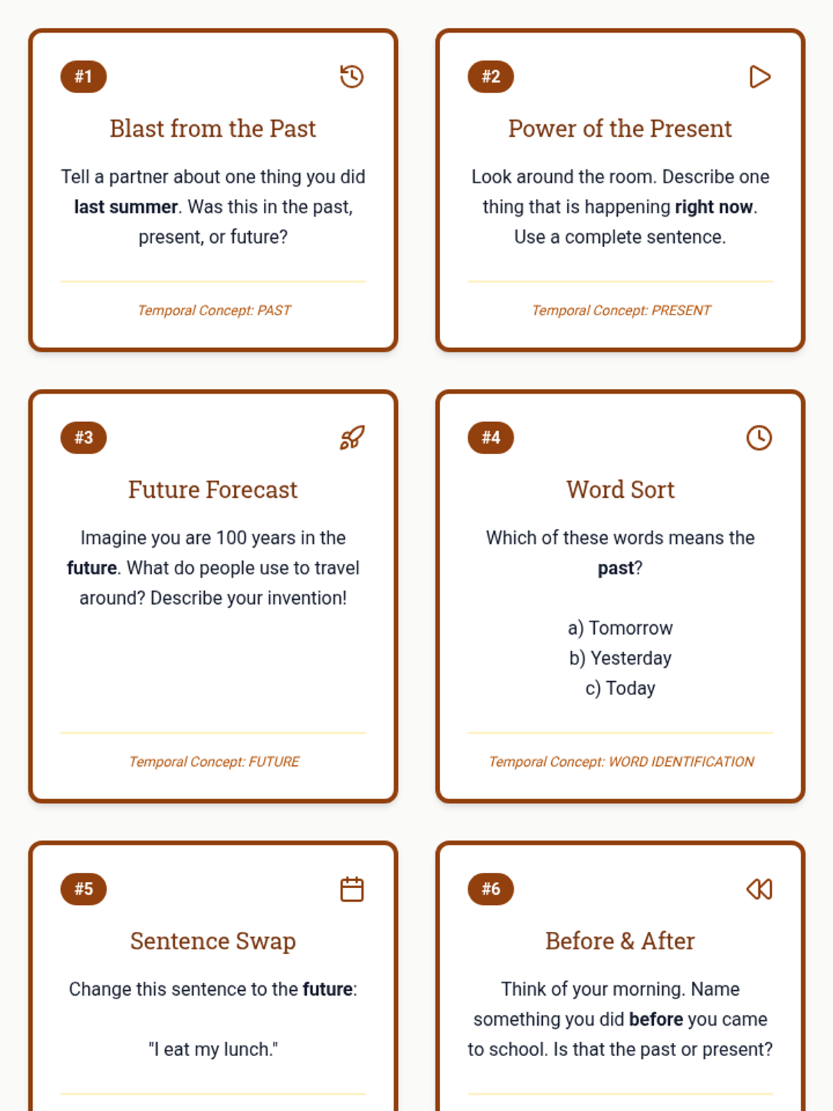 A set of 8 interactive task cards designed for small groups or individual practice, encouraging students to apply their knowledge of past, present, and future to real-life scenarios.