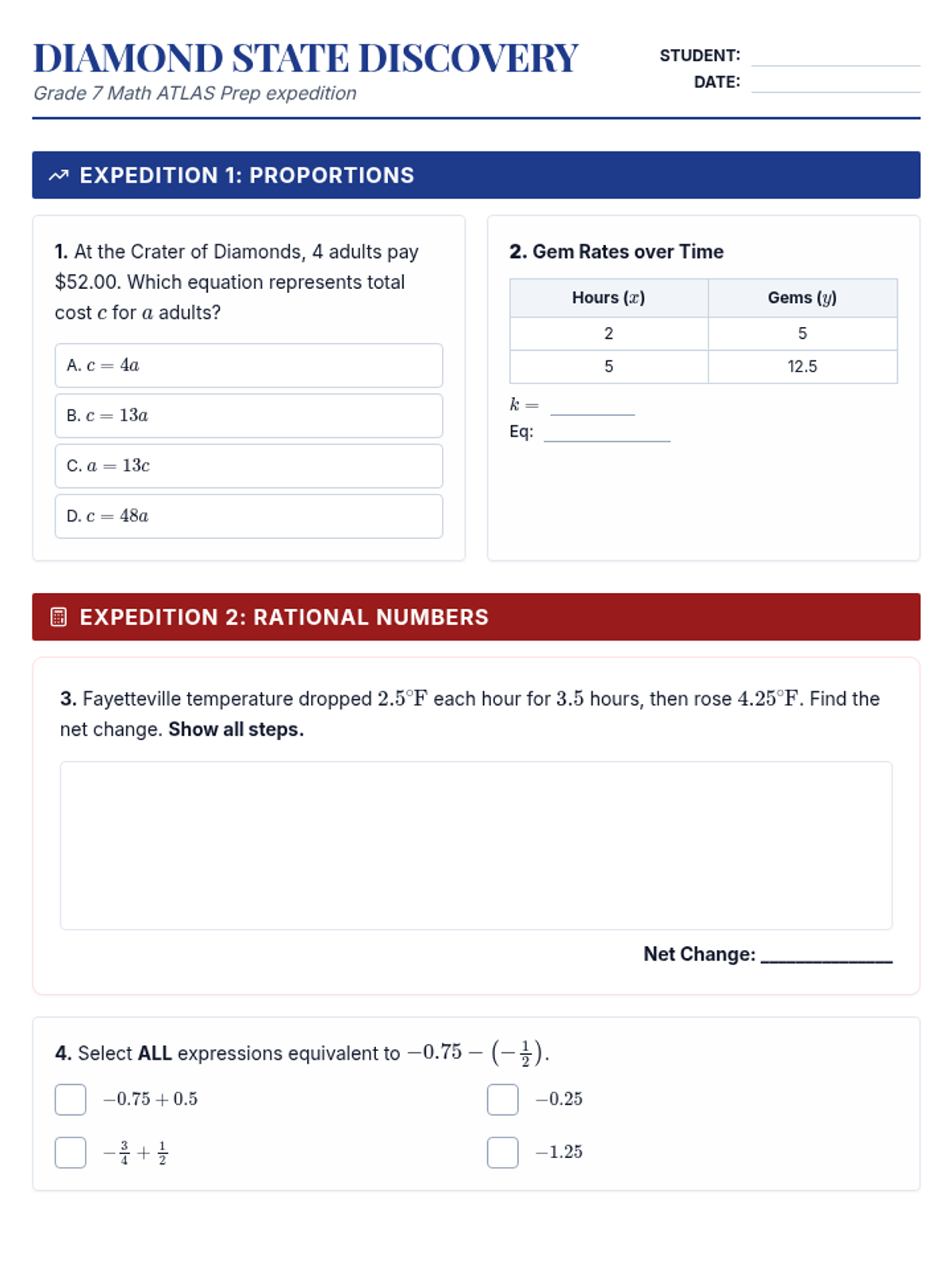 Interactive slide deck for Grade 7 ATLAS math prep, featuring Arkansas-themed examples, strategy tips, and step-by-step practice for proportional relationships, rational numbers, geometry, and probability.