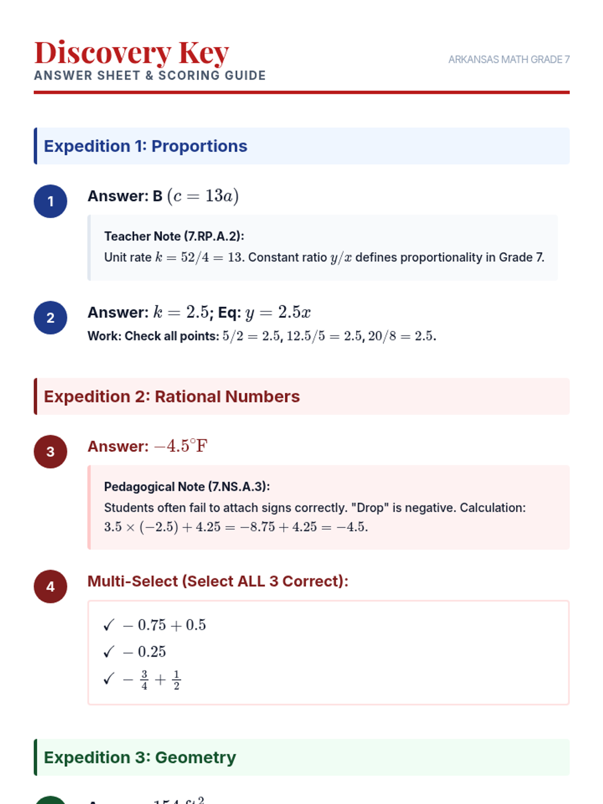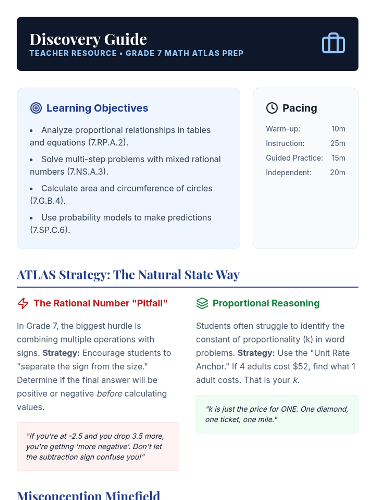 Teacher's guide for the Grade 7 Math ATLAS prep lesson, including Arkansas standard alignments, misconception alerts, instructional strategies for rational numbers, and a guide to ATLAS question formats.