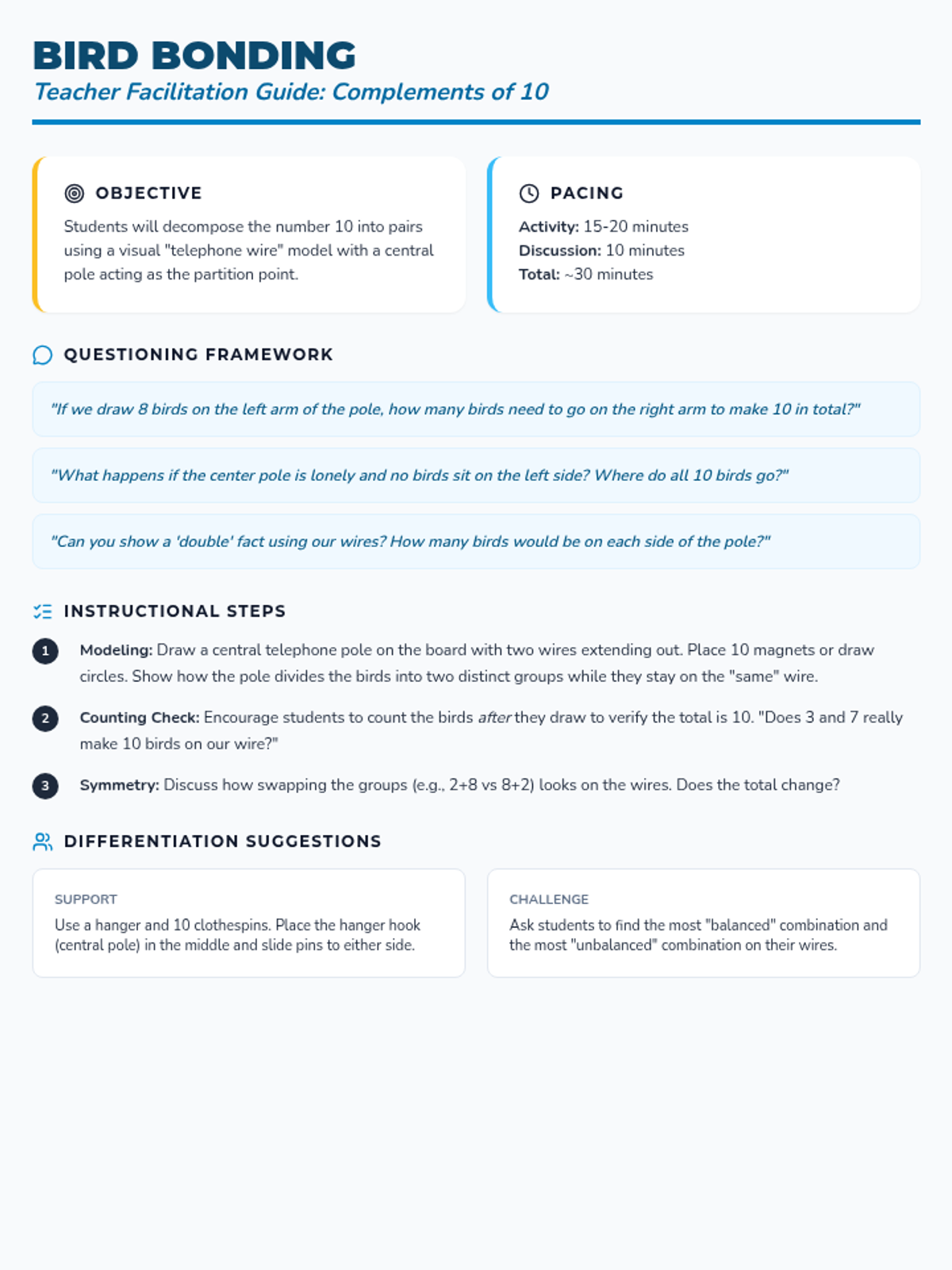 A comprehensive teacher guide for facilitating the Addition Top-It game, including step-by-step instructions, discussion prompts, and differentiation strategies for kindergarten learners.
