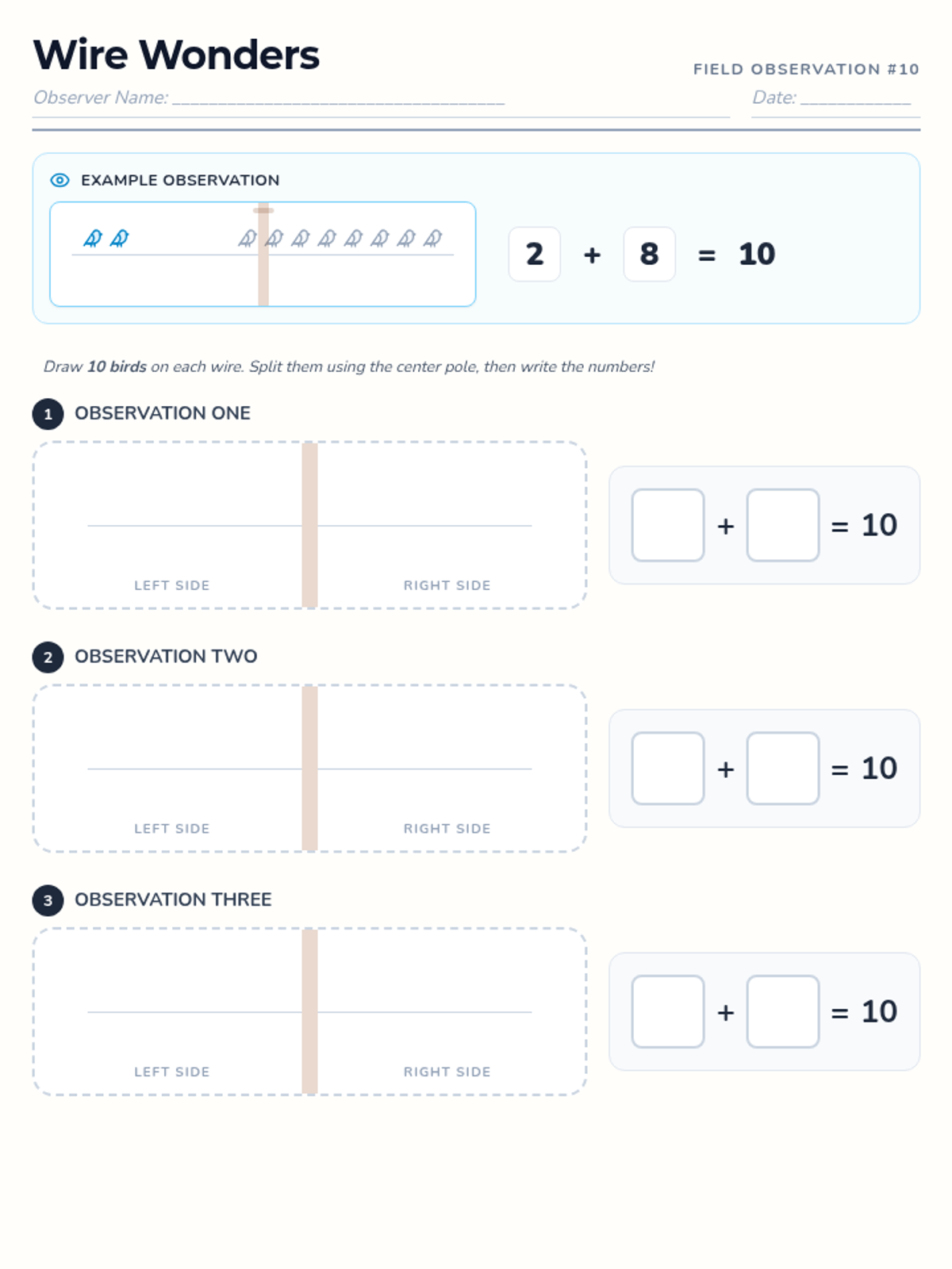 A student worksheet for drawing and recording combinations of ten birds on telephone wires. Split across two pages to provide ample drawing space. Page 1 includes an example and 3 practice problems; Page 2 includes 3 additional larger practice problems. Cleaned up HTML classes and standardized formatting.
