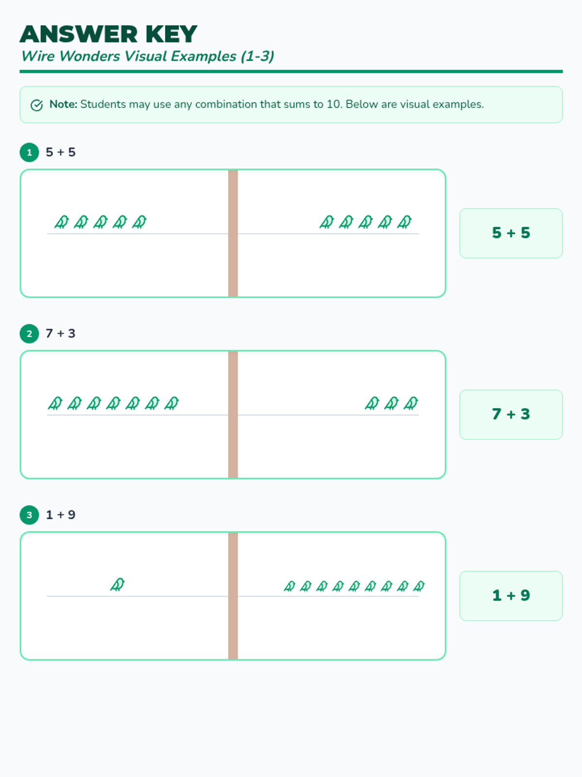 An answer key for the Wire Wonders Worksheet split across two pages. Shows visual examples of birds grouped on either side of a central pole for all six practice problems. Standardized icon sizes and improved pole visibility. Revised to fix icon overlaps and footer positioning. Standardized headers and equation boxes across both pages. Added missing wire lines to Page 2. Improved bird grouping layout for higher counts.