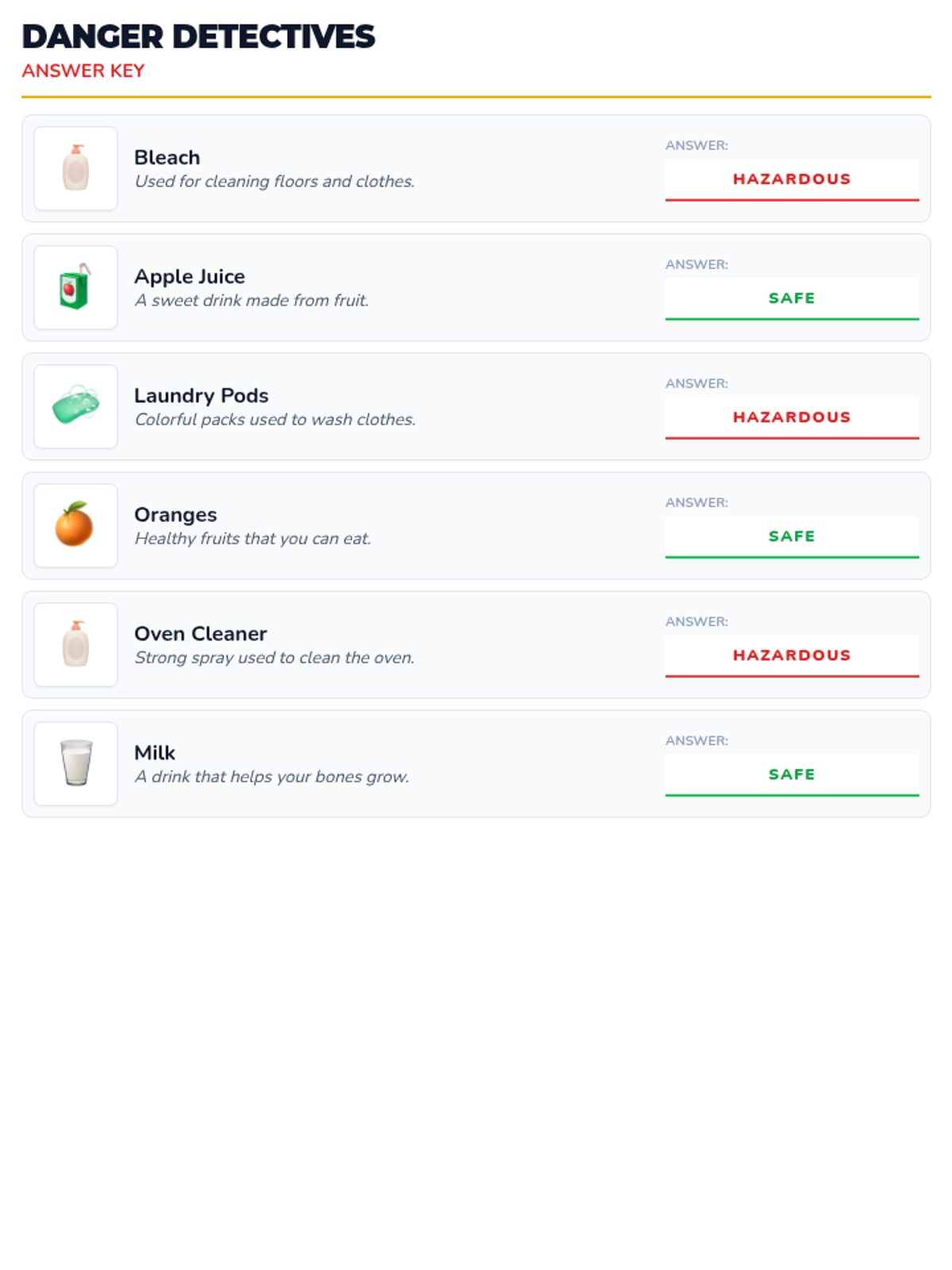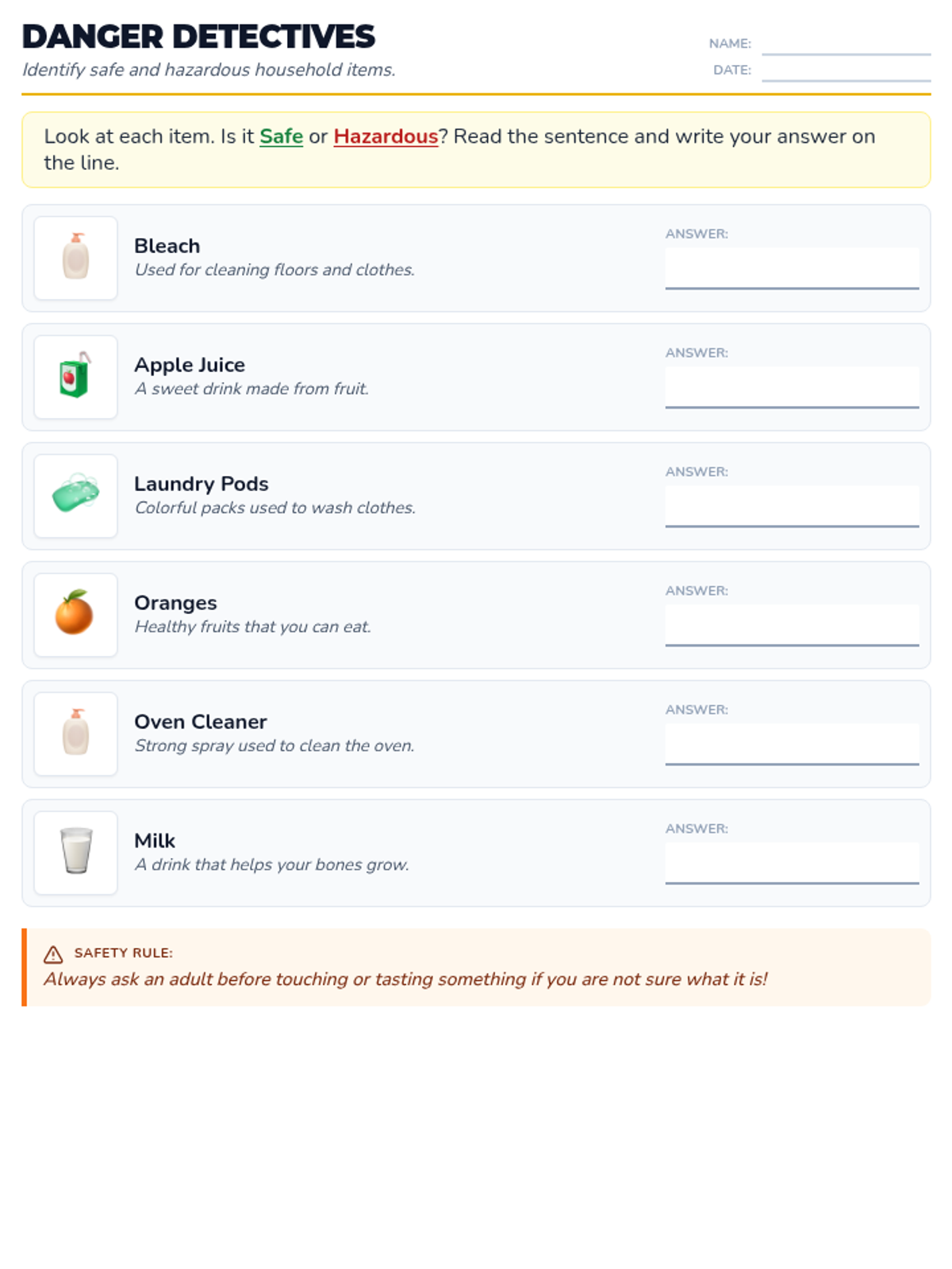 A visual worksheet for identifying safe and hazardous household substances with short descriptive sentences. Updated Oven Cleaner icon for visual consistency and accuracy.