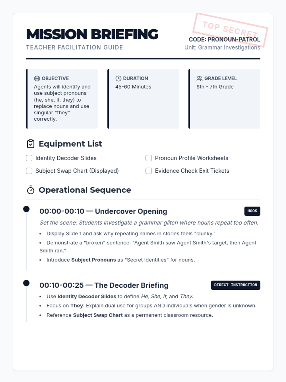 A comprehensive mission briefing guide for teachers, outlining the lesson flow, pacing, materials, and discussion prompts for the Pronoun Patrol Investigation. Includes differentiation tips and scripting support. Revised to fix layout and page breaks.