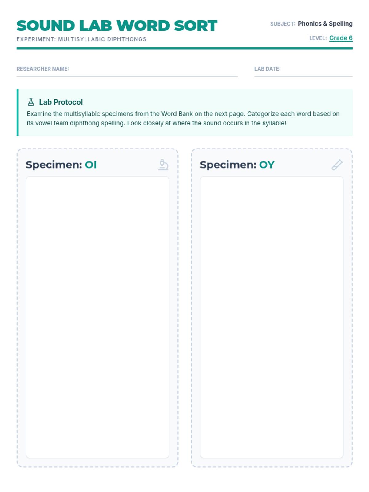 A revised two-page interactive word sort for Grade 6 students. Layout optimized to prevent content cutoff, with expanded writing lines for better usability.