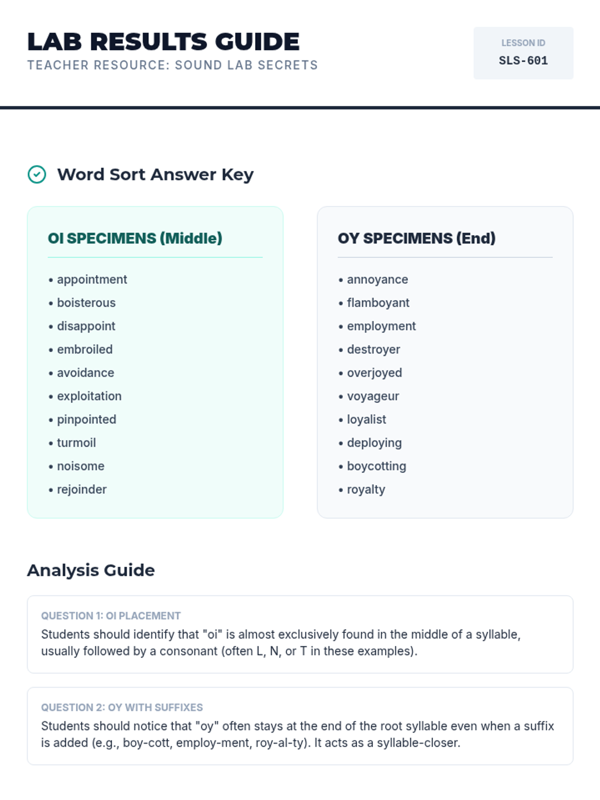 A comprehensive teacher guide and answer key for the Sound Lab Secrets lesson. Features a categorized answer key for the word sort, sample analysis answers, and strategies for differentiation.