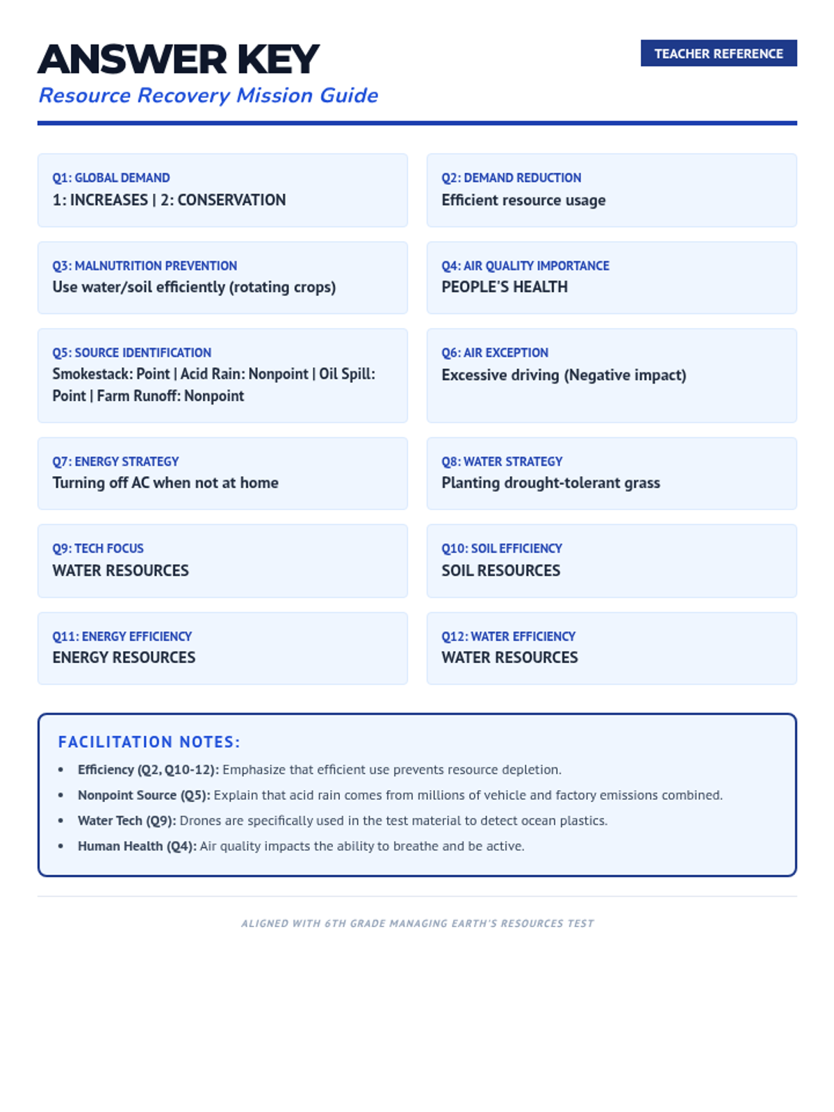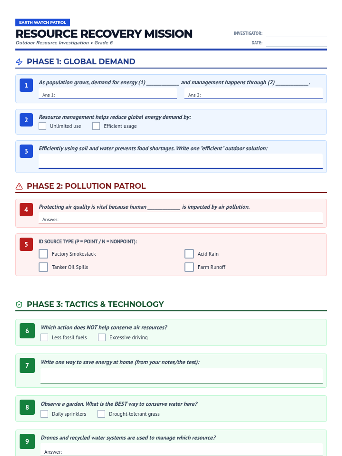 An outdoor Earth resources scavenger hunt activity for 6th graders. Students complete 12 test-aligned questions while observing their surroundings, covering energy demand, air quality, pollution types, and conservation strategies for water, soil, and energy. Revised for handwriting space.