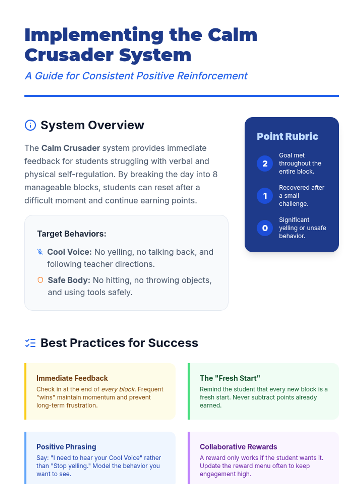 An instructional guide for teachers and parents on how to effectively implement the Calm Crusader behavior system, featuring scoring rubrics, best practices, and reward brainstorming. Revised to fix page breaks and add a notes section.