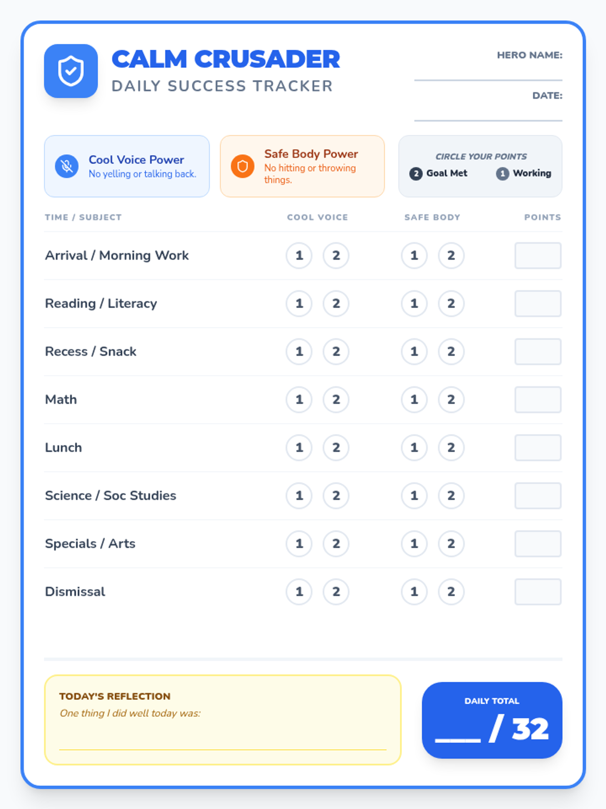 A superhero-themed daily behavior tracking chart for elementary students, featuring sections for 'Cool Voice' and 'Safe Body' power goals with a point-based scoring system. Revised for improved layout and fitting on a single page.