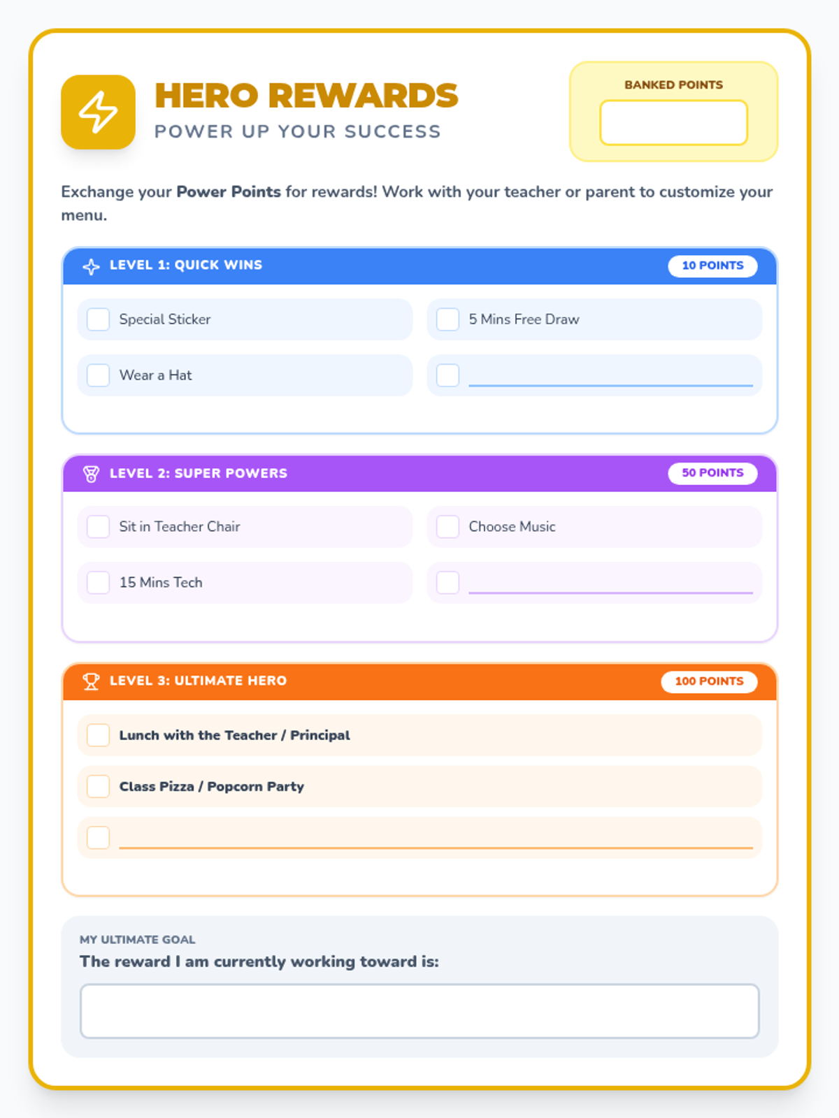 A tiered reward menu worksheet where students can 'spend' points earned from their behavior tracker on small, medium, and large incentives. Revised for improved layout and larger banked points field.