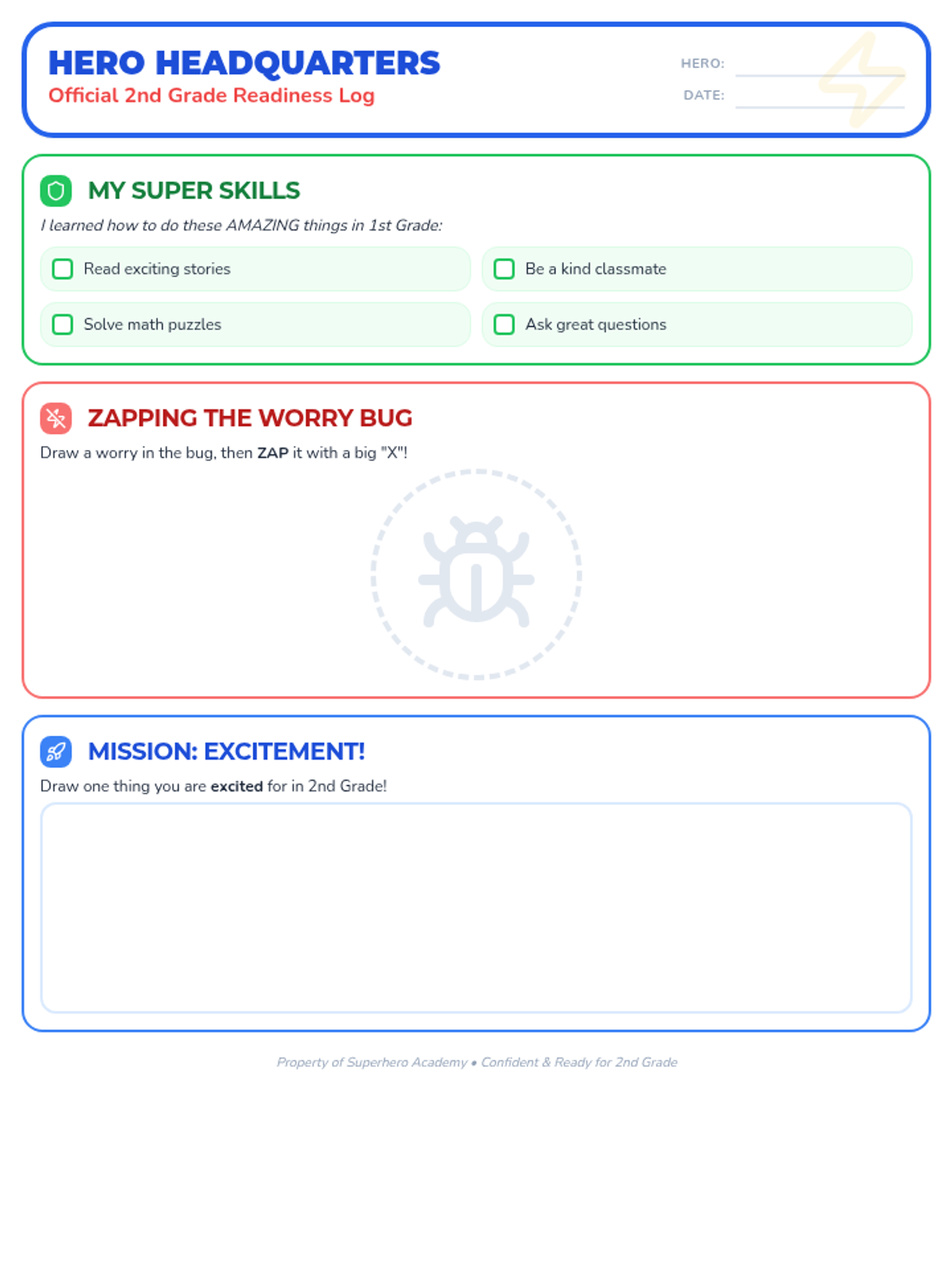 A fun, interactive worksheet for 1st graders to process their feelings about moving to 2nd grade. It includes a skill inventory, a 'worry bug' zapping activity, and a space to draw future goals.