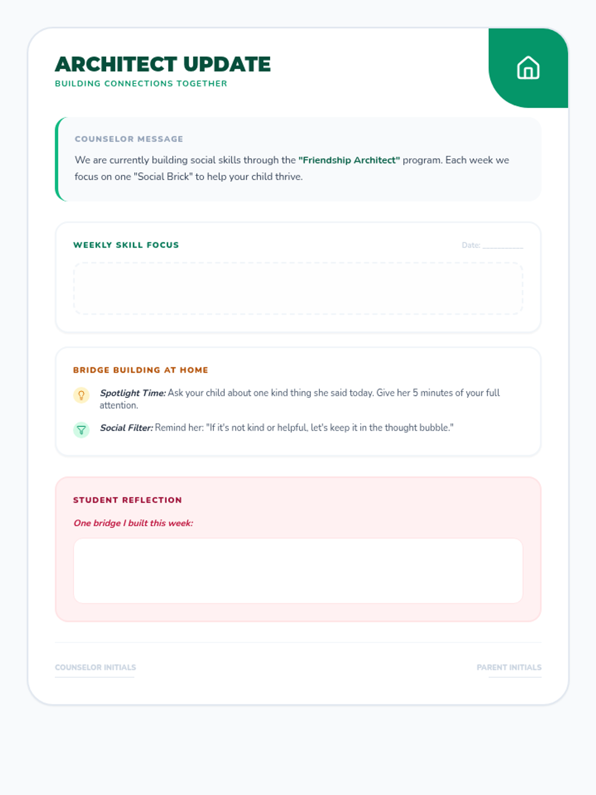 A parent-school communication template designed to bridge intervention goals between school and home, including weekly progress updates and supportive home-based activities.