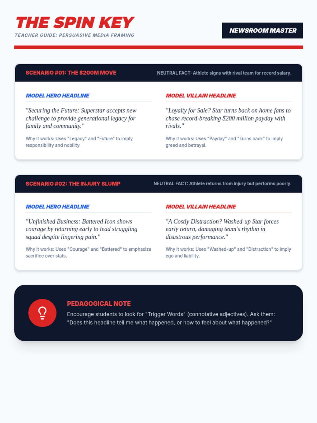 An answer key for the Spin Zone worksheet, providing model hero and villain headlines for the sports scenarios and explaining the persuasive strategy behind each choice.