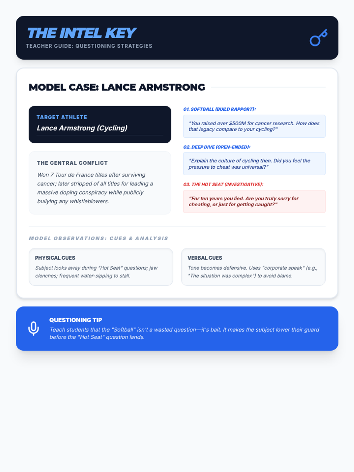 An answer key for the Interview Intel guide, featuring a case study of Lance Armstrong to demonstrate how to layer questions and analyze verbal/physical cues during an investigative interview.
