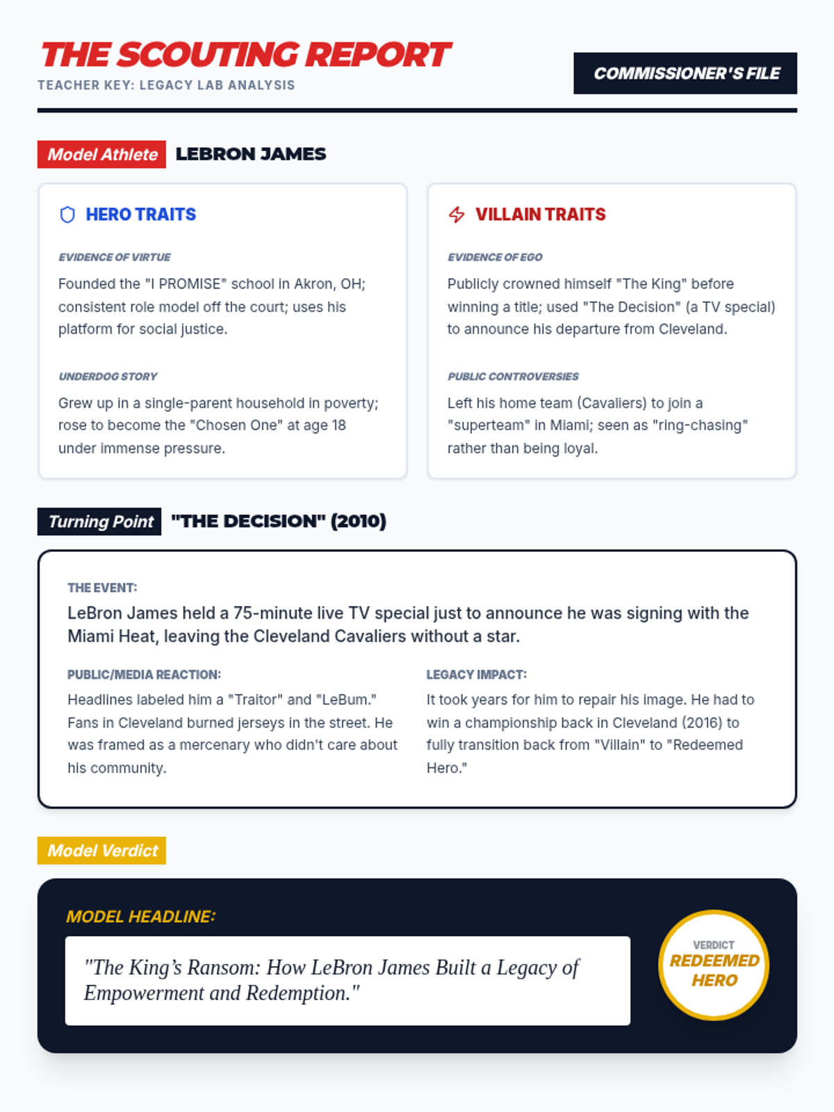 An answer key and model for the Legacy Lab worksheet, using LeBron James as a case study to show how an athlete's narrative can shift from hero to villain and back again.