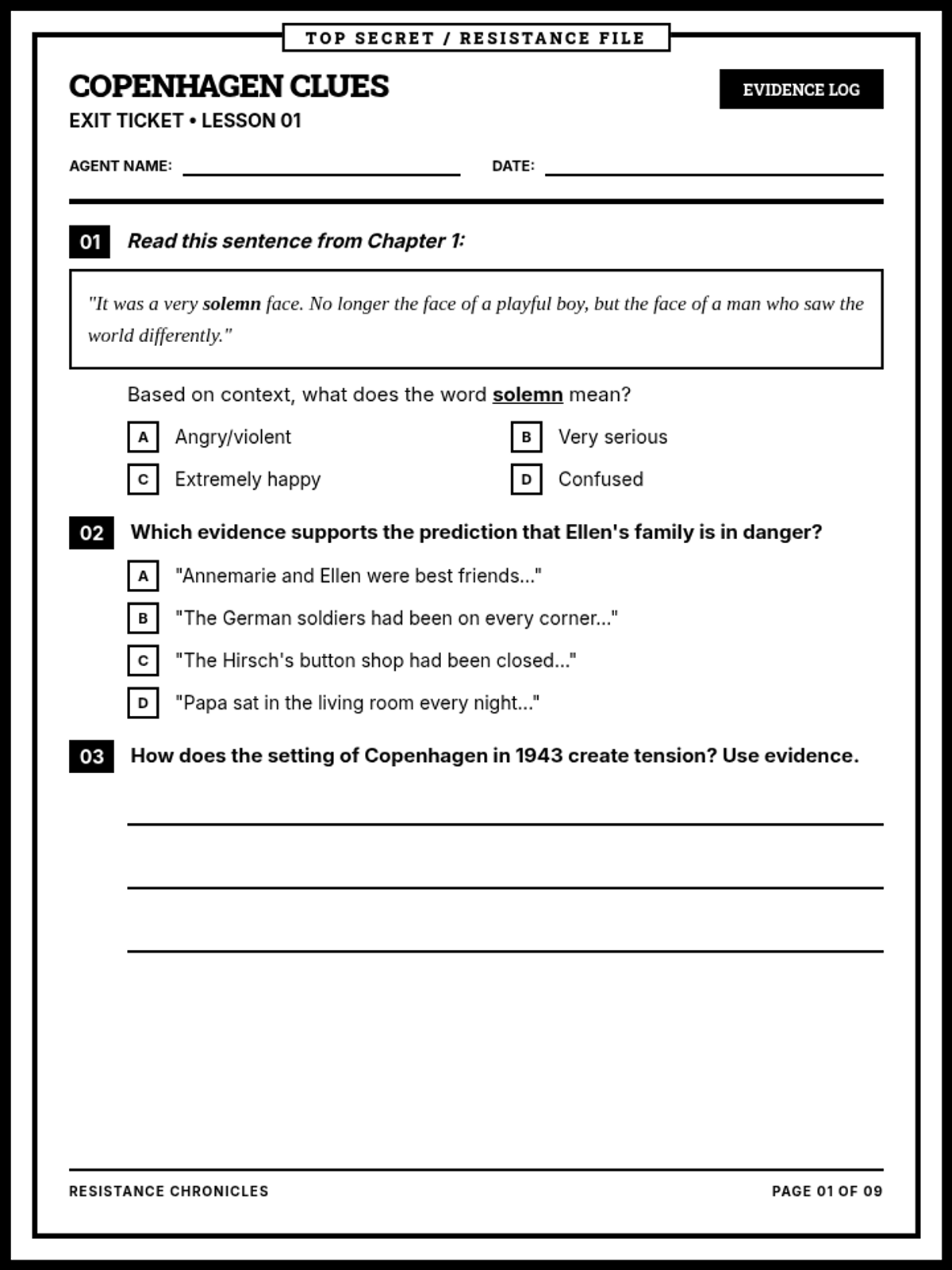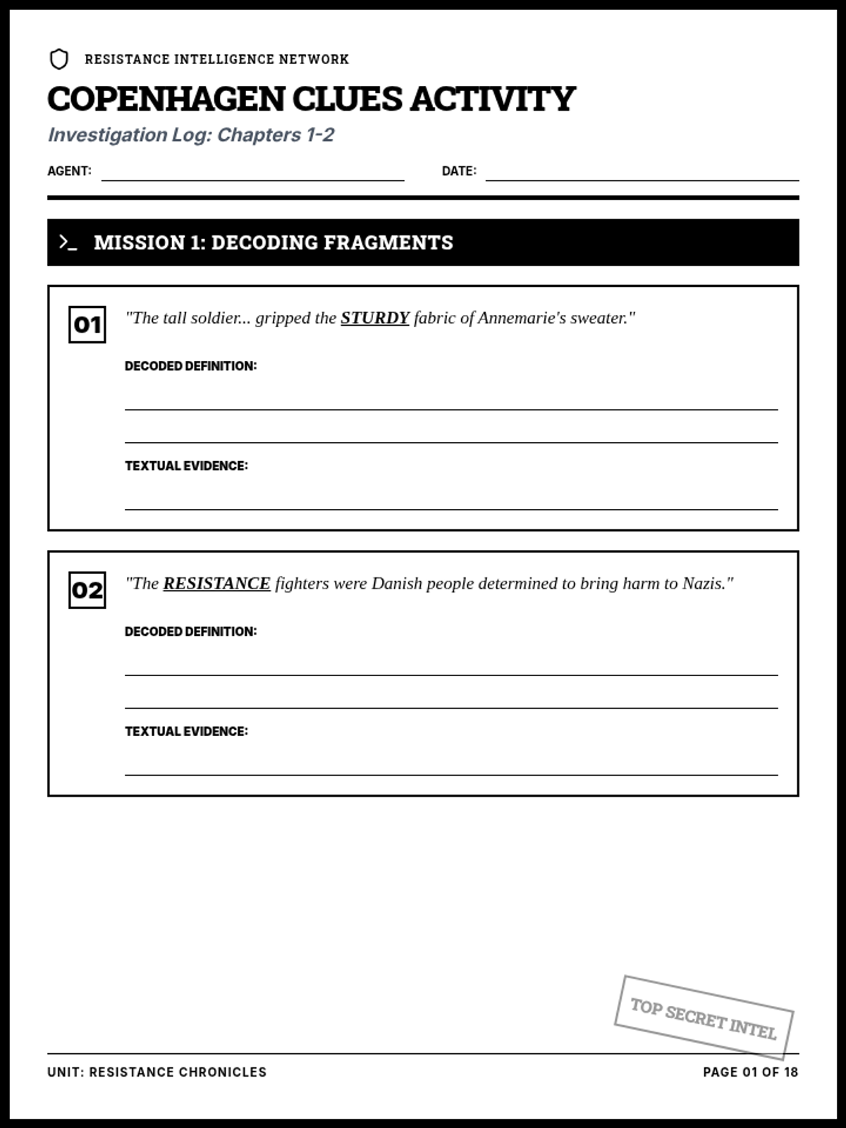 A detective-themed context clues worksheet featuring a short mystery passage. Students analyze five challenging vocabulary words, providing definitions and identifying specific textual evidence used to decode their meanings. This version includes optimized page breaks and space allocation.