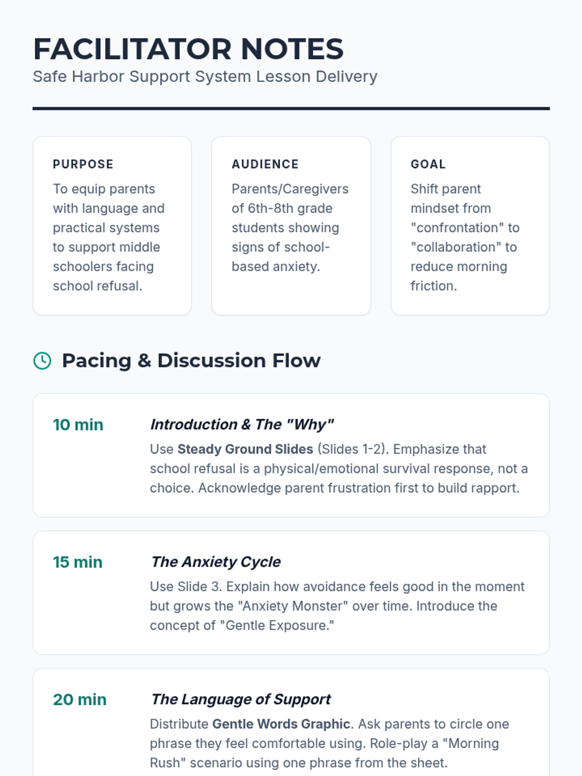 A guide for educators or counselors to facilitate a parent workshop using the Safe Harbor materials, including pacing, discussion prompts, and key talking points.