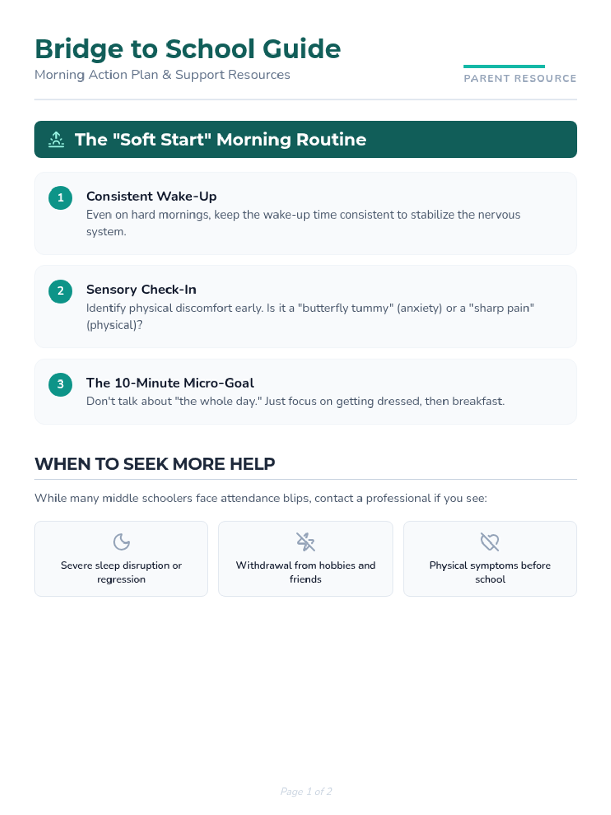 A detailed handout for parents providing a morning action plan, school partnership strategies, and self-care tips for managing school refusal and high anxiety.