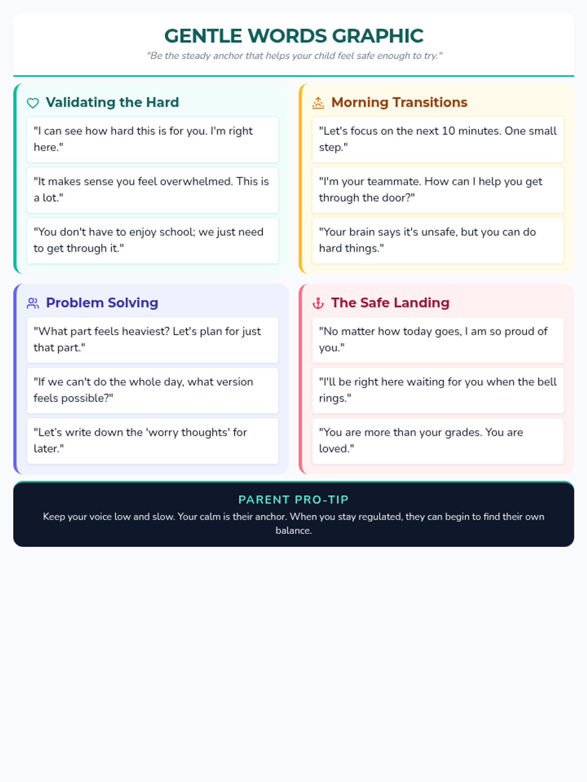 A visual reference guide for parents featuring supportive and empathetic statements categorized by situation to help middle schoolers facing anxiety and school refusal.
