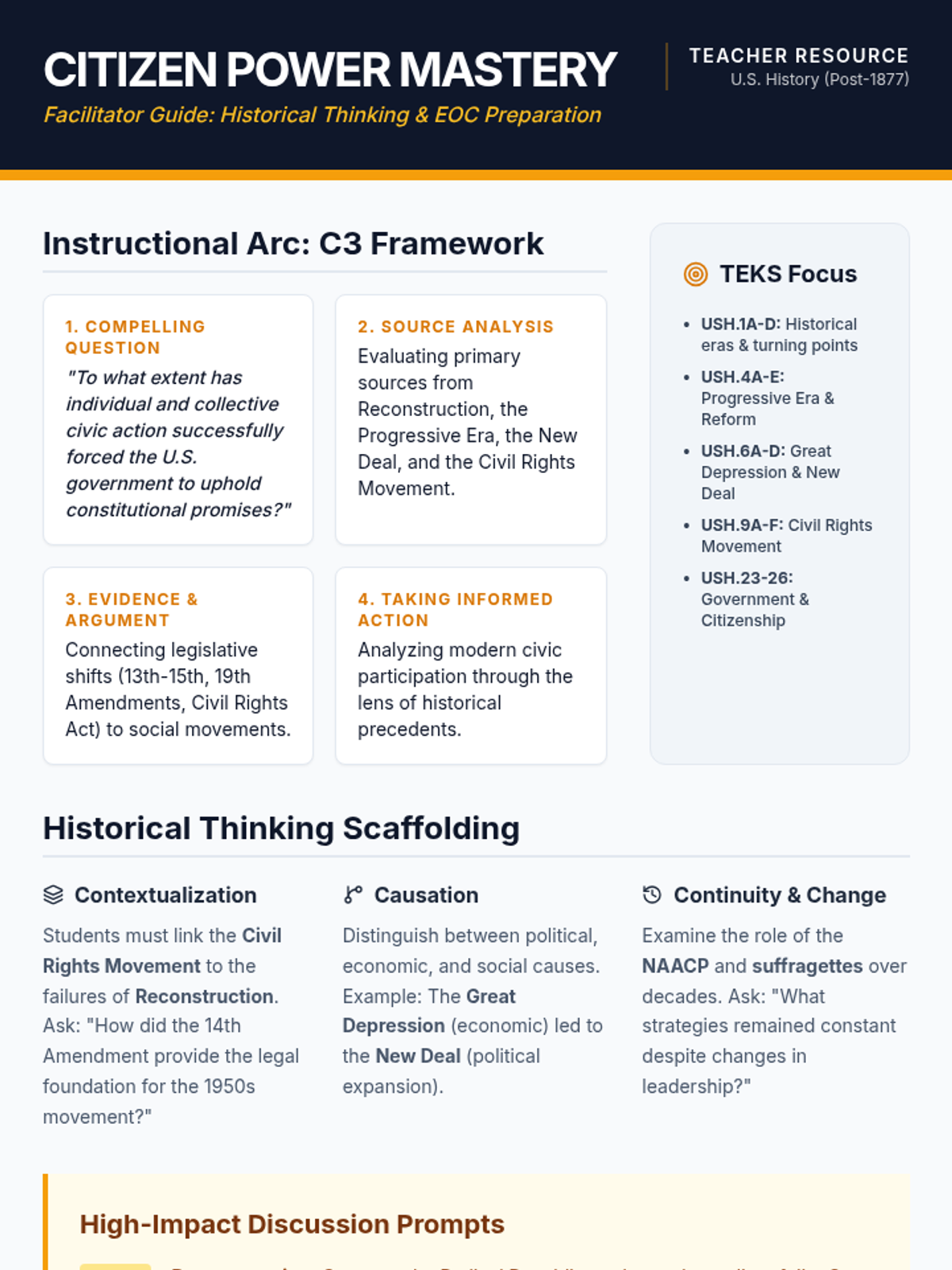 A comprehensive facilitator guide for the Citizen Power Mastery lesson, featuring C3 inquiry arcs, historical thinking scaffolds, and TEKS-aligned discussion prompts across major U.S. history eras.