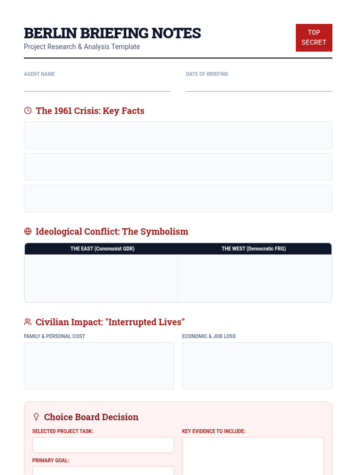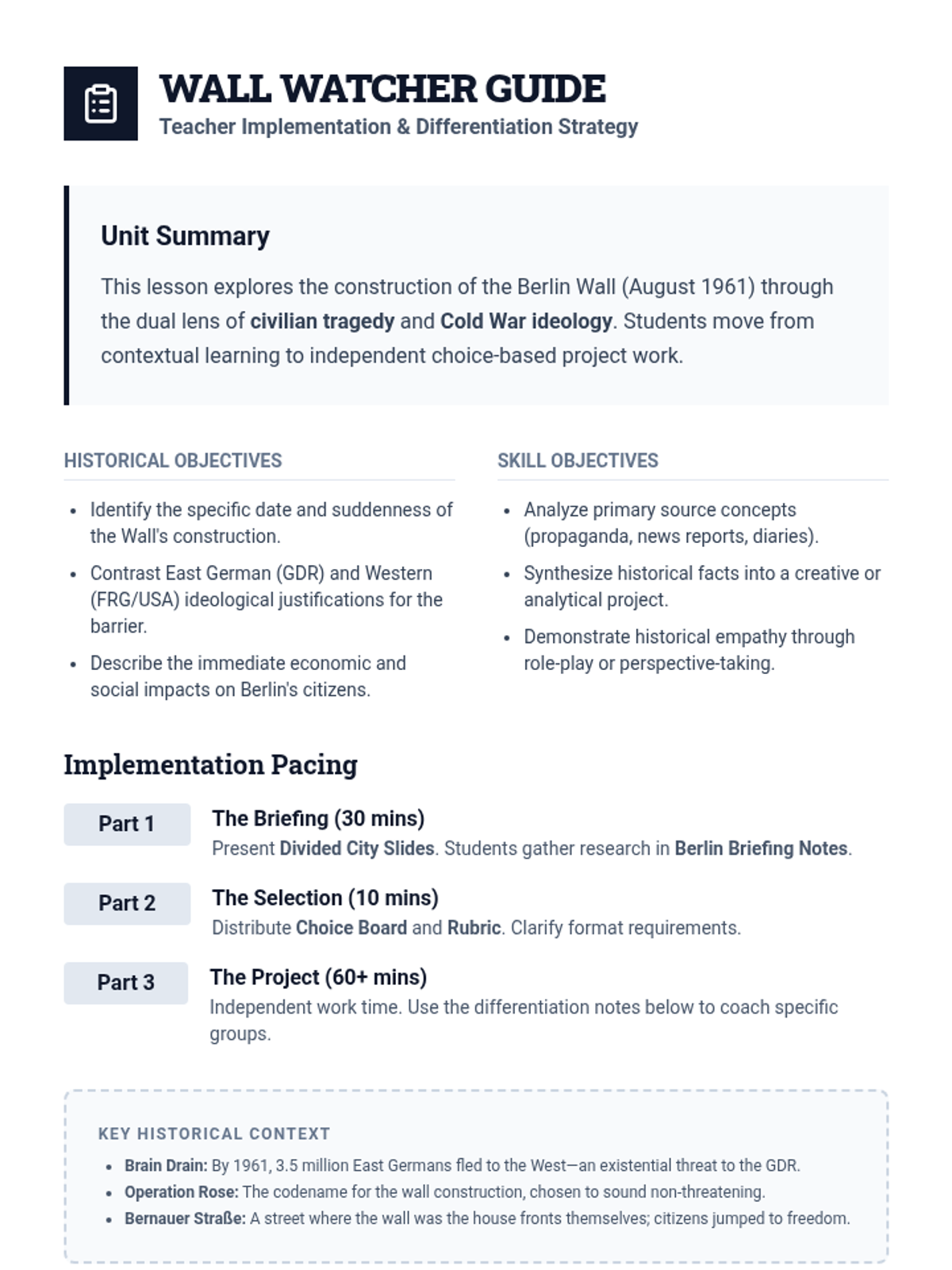 A detailed teacher guide for implementing the Berlin Wall project, including learning objectives, pacing suggestions, and a breakdown of the differentiation strategy used in the choice board.