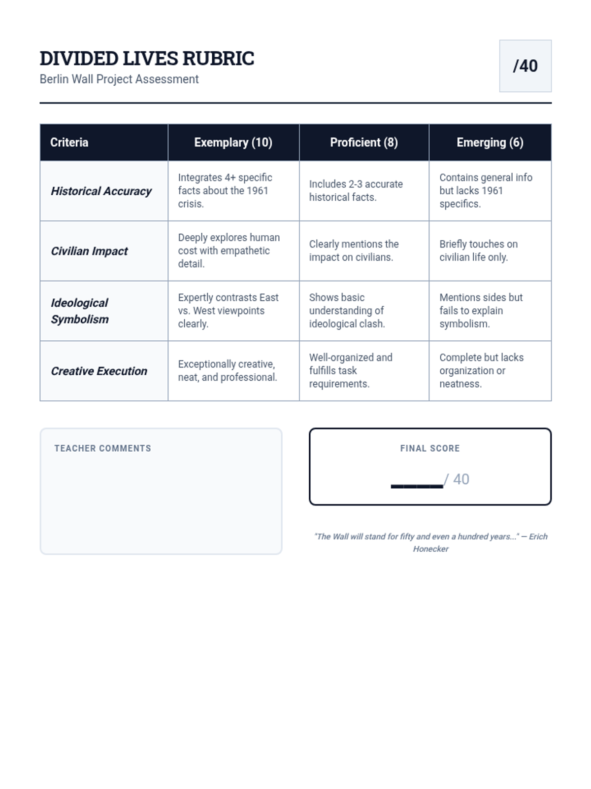 A comprehensive rubric for assessing the Berlin Wall project, evaluating historical accuracy, civilian impact, ideological symbolism, and creative execution.