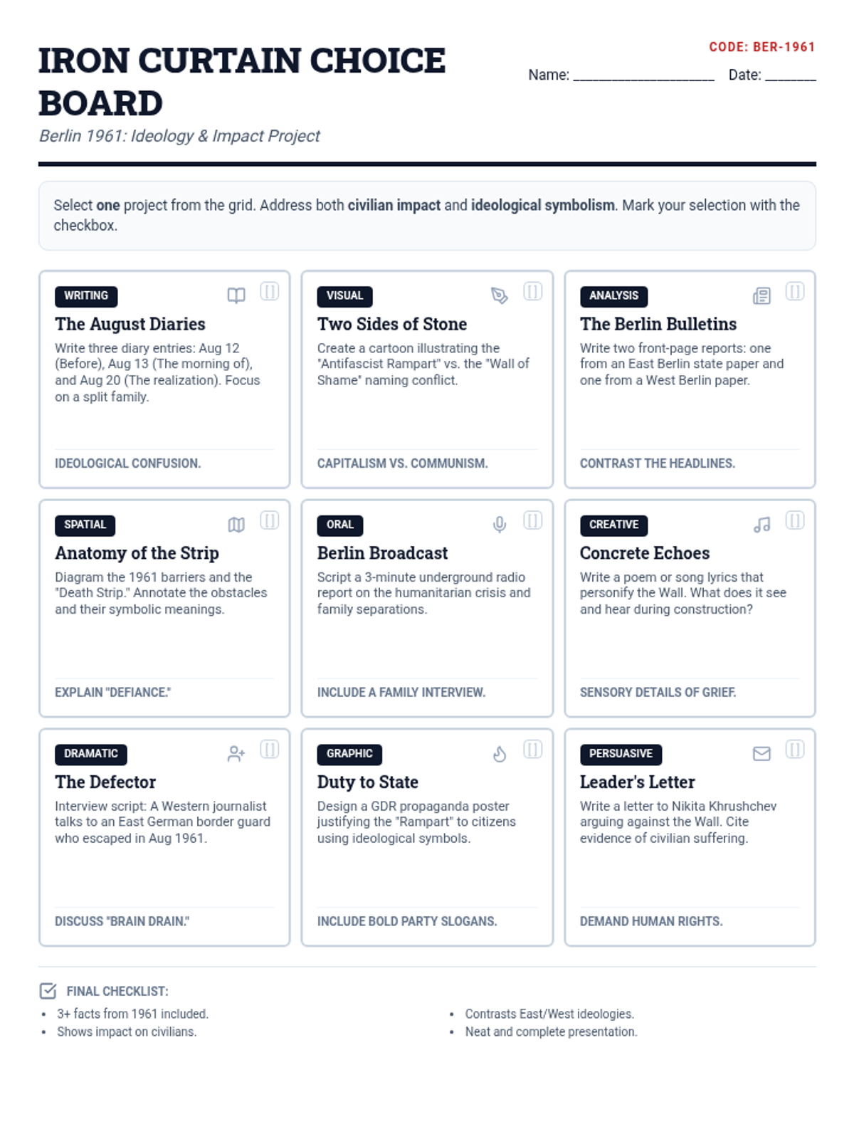 A differentiated choice board for a Berlin Wall project, offering nine diverse tasks categorized by skill set (writing, visual, oral, etc.) focused on the 1961 construction.