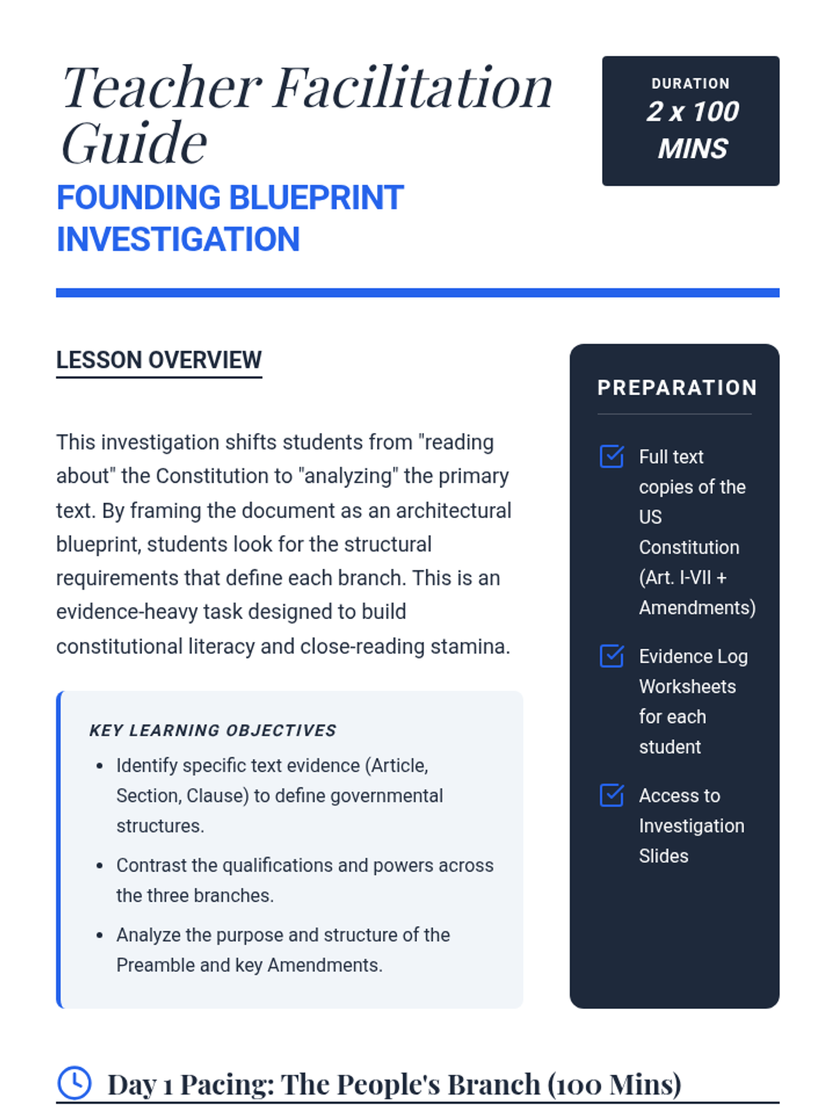 A detailed facilitation guide for teachers leading a two-day Constitution analysis, including pacing, troubleshooting, and scaffolds for students. Updated with expanded scope and Day 1/2 specific instructions.