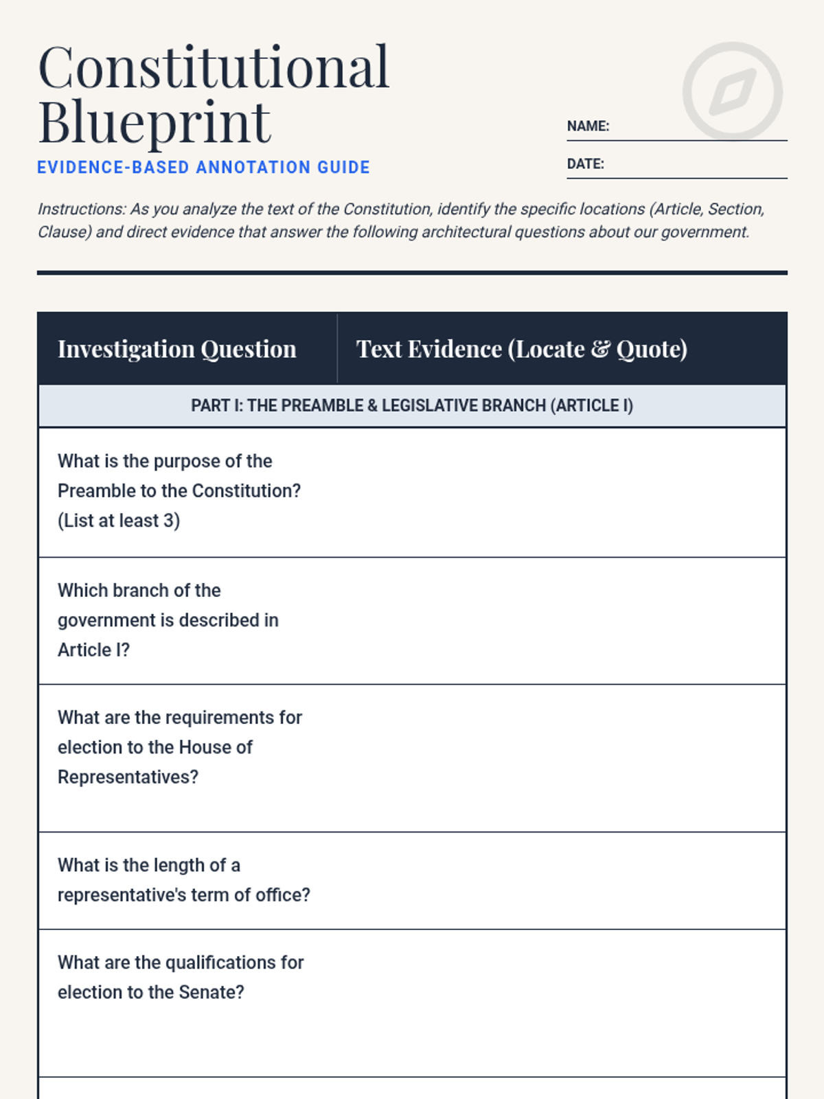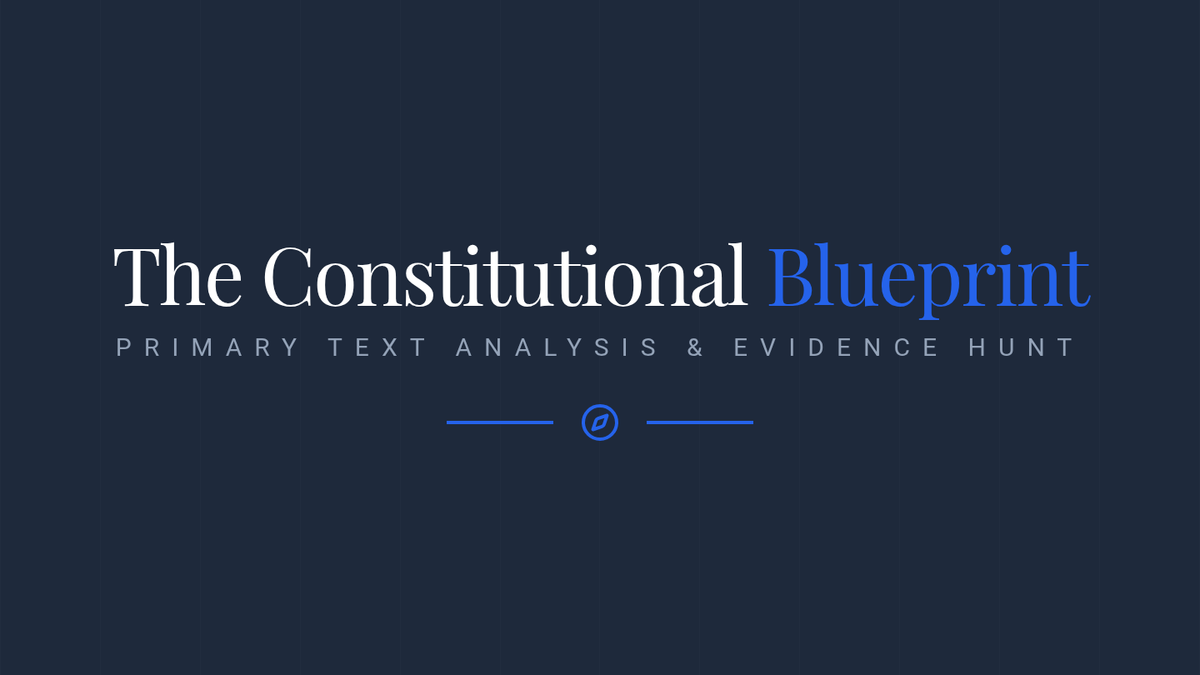 Visual presentation for the two-day Constitution primary text analysis, guiding students through the annotation process and key sections of the text. (Revised for clarity, balance, and contrast).