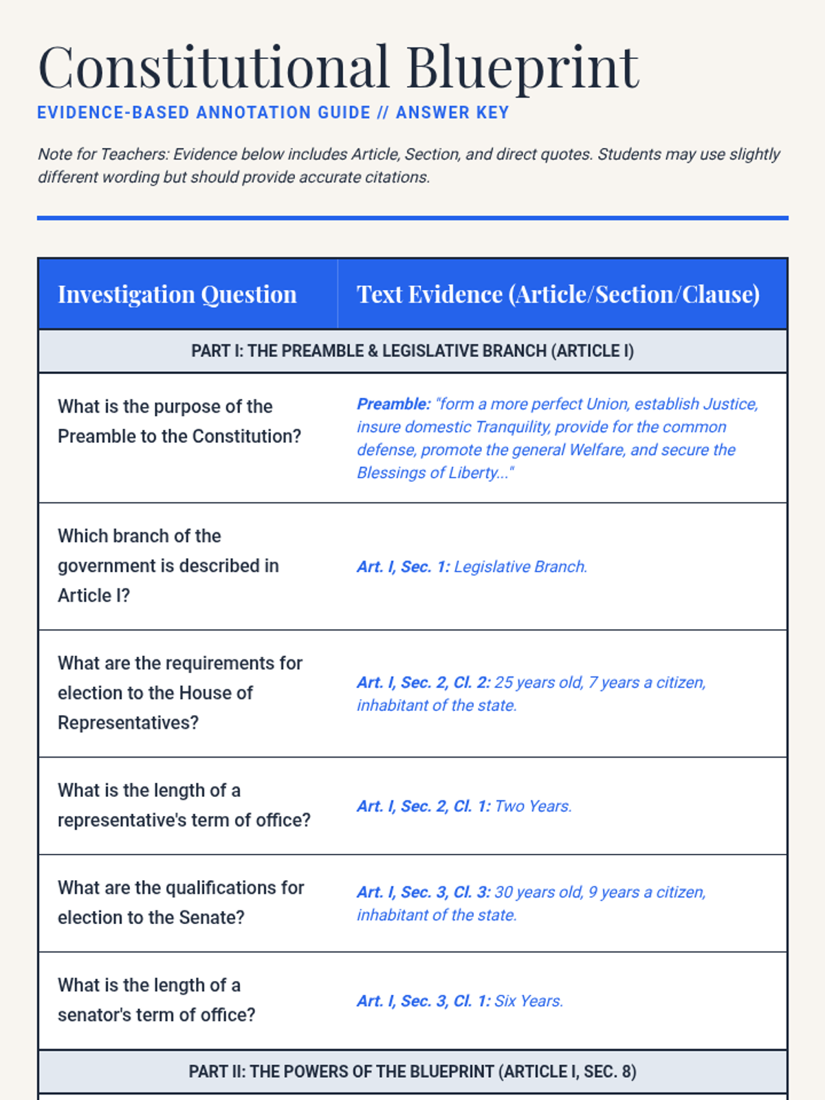 An answer key for the Constitution Evidence Log, providing specific Article/Section citations and direct quotes for each question. Updated to match expanded worksheet.