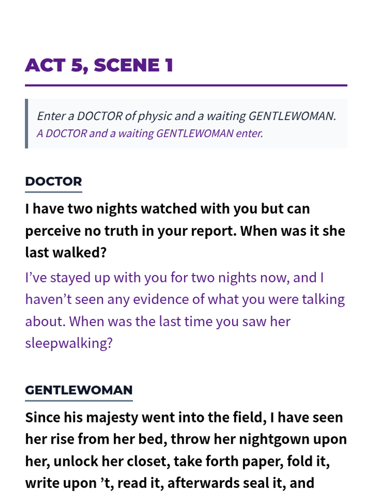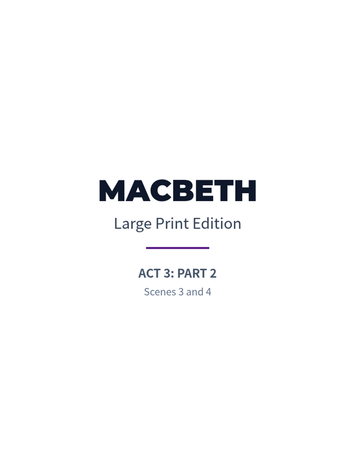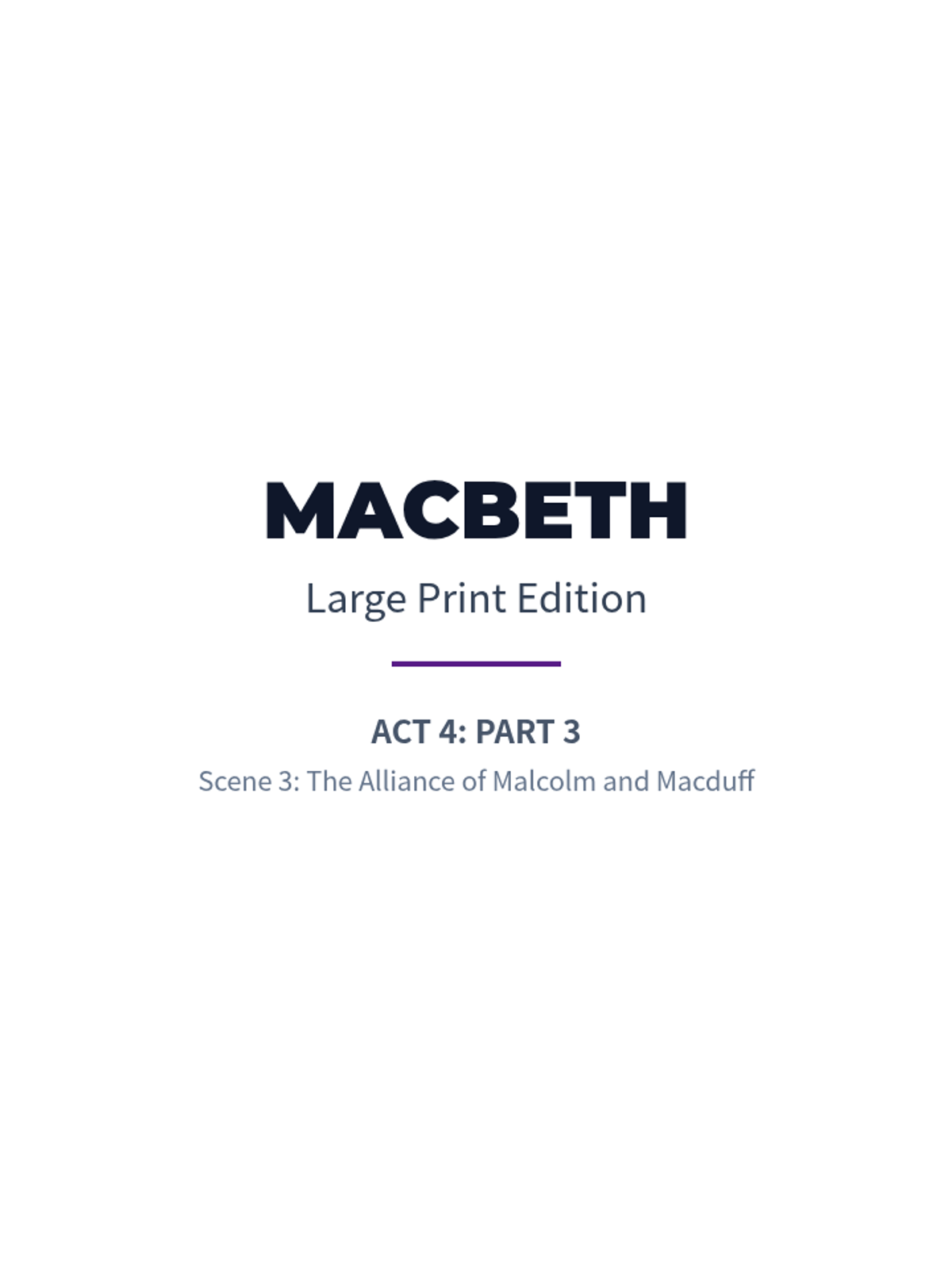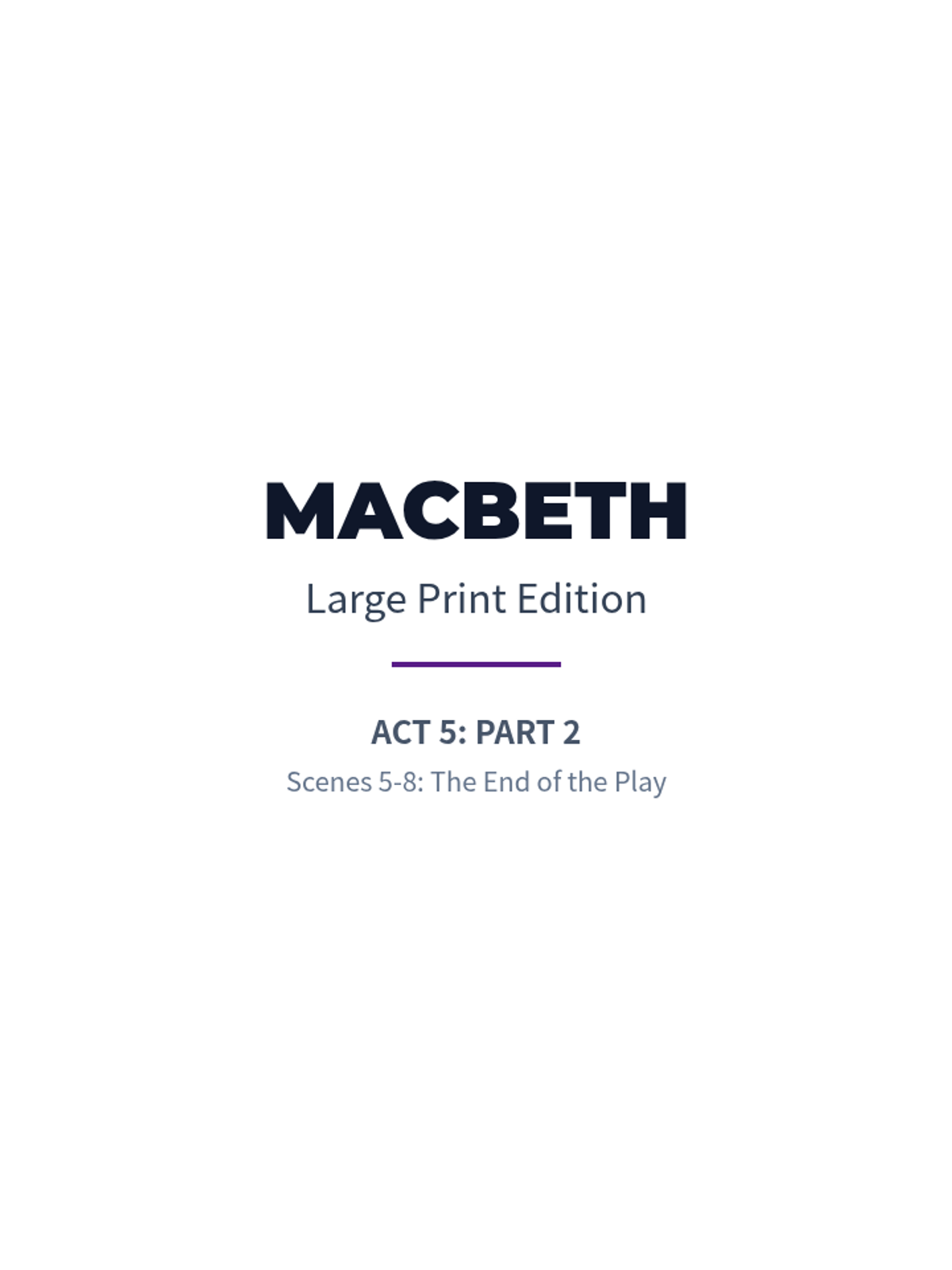 The first part of Macbeth Act 5, covering Scenes 1-4. Features 20pt font for large-print accessibility, dark purple modern text for contrast, and improved layout to ensure speech blocks remain cohesive on the page.