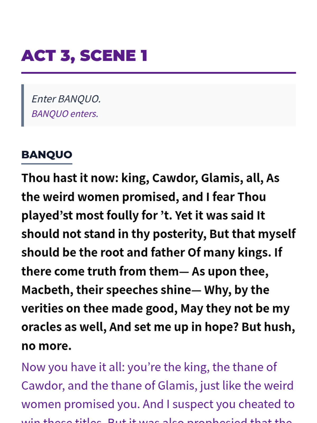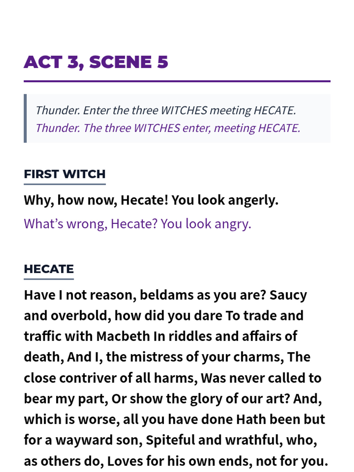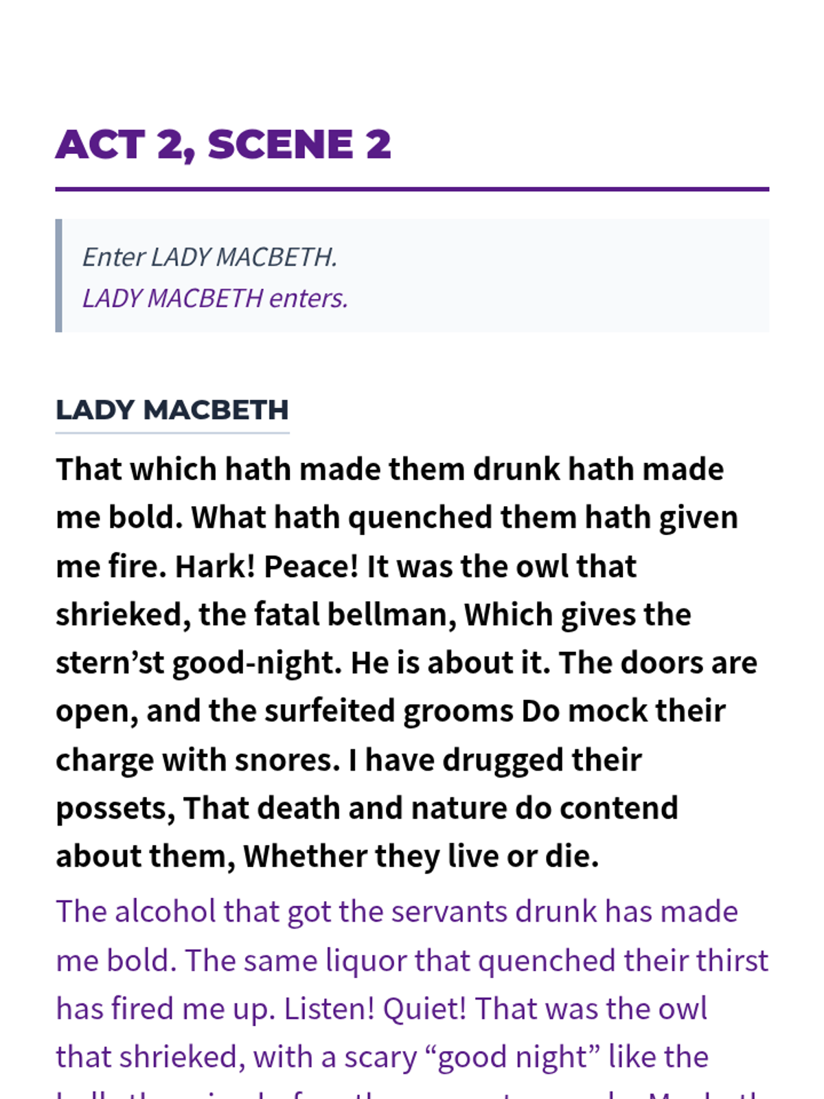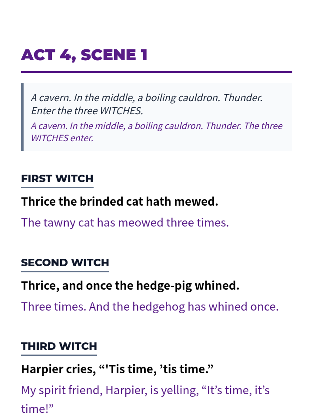 The first part of Macbeth Act 5, covering Scenes 1-4. Features 20pt font for large-print accessibility, dark purple modern text for contrast, and improved layout to ensure speech blocks remain cohesive on the page.