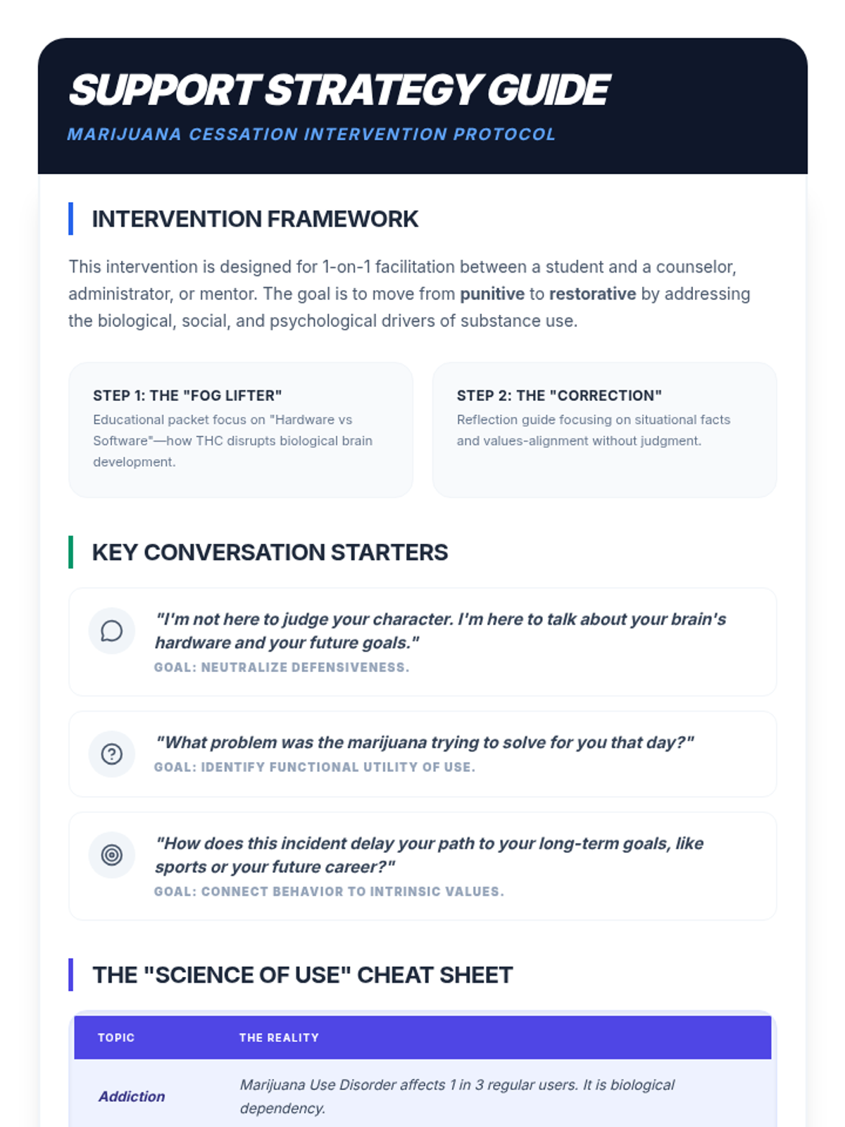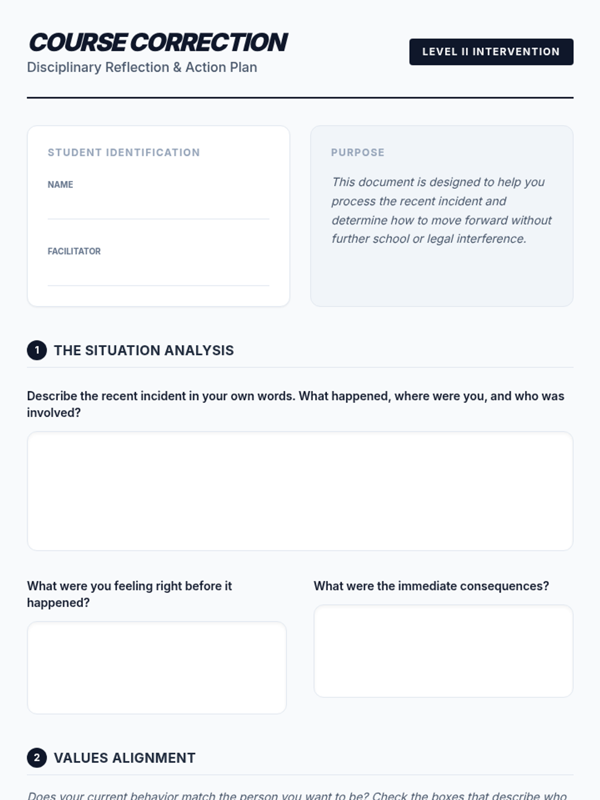 A specialized two-page rerouting guide for typical middle school classroom disruptions, providing students with concrete replacement behaviors for issues like blurting, wandering, tech misuse, and off-task talking. Includes a facilitator guide for teachers.
