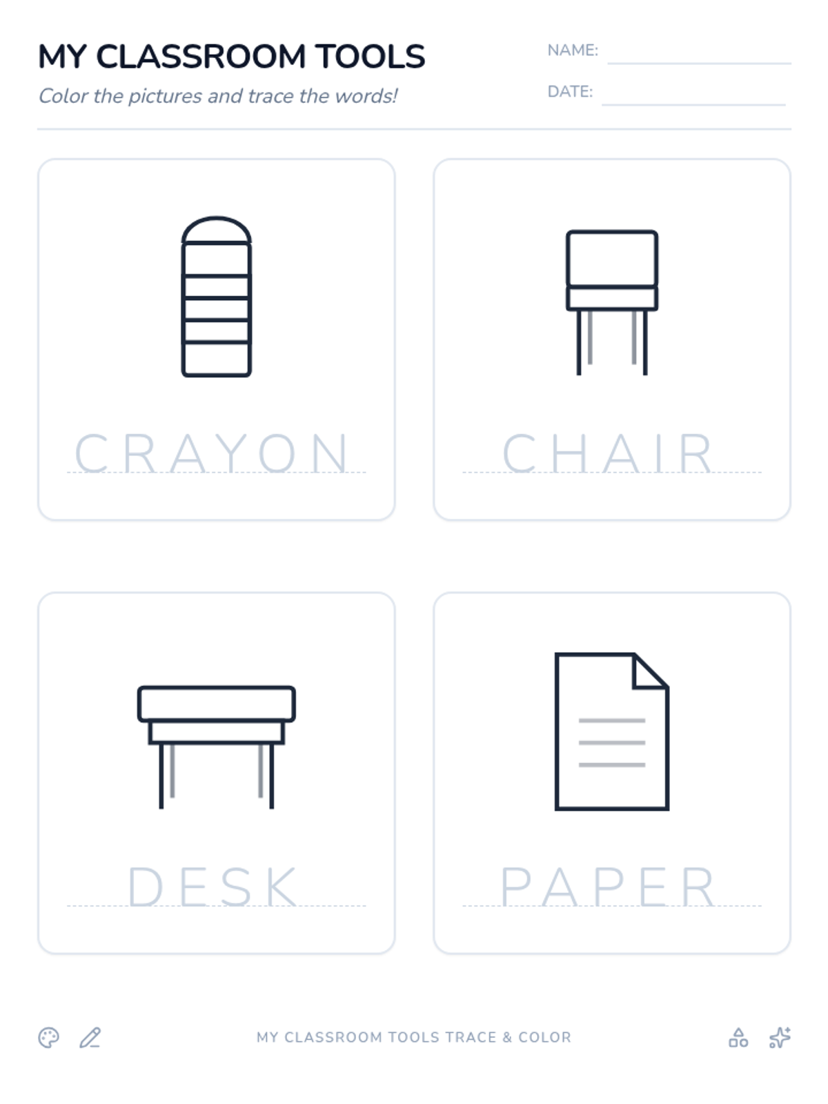A single-page coloring and tracing worksheet featuring four classroom objects: a crayon, a chair, a desk, and paper. Each section includes a large, simple illustration for coloring and the word in light gray for tracing.