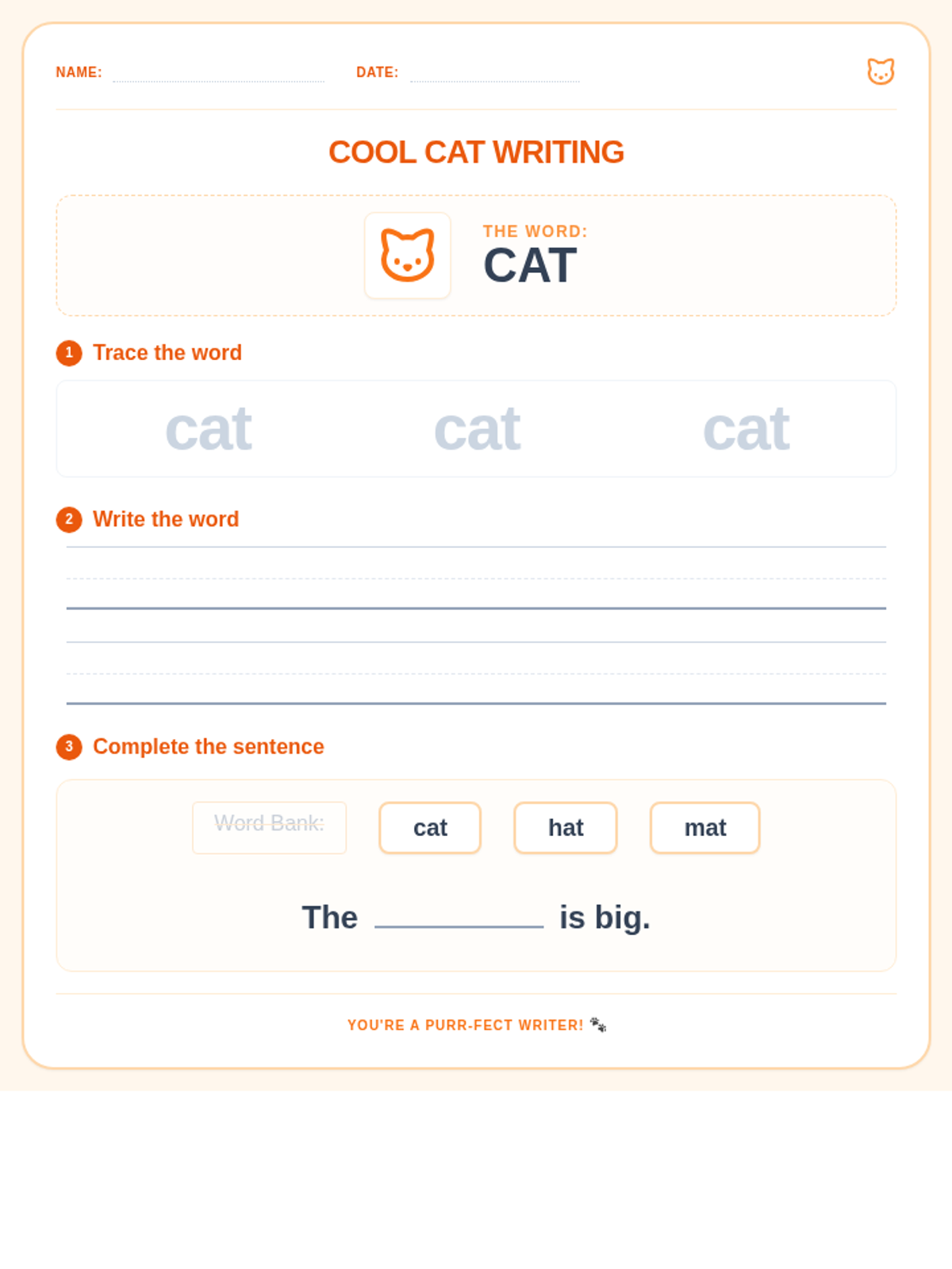 Final version of the cat writing worksheet. Includes improved tracing visibility, standardized primary writing lines, and a sentence completion task with distractor words (cat, hat, mat) for pedagogical value. Optimized for single-page printing.