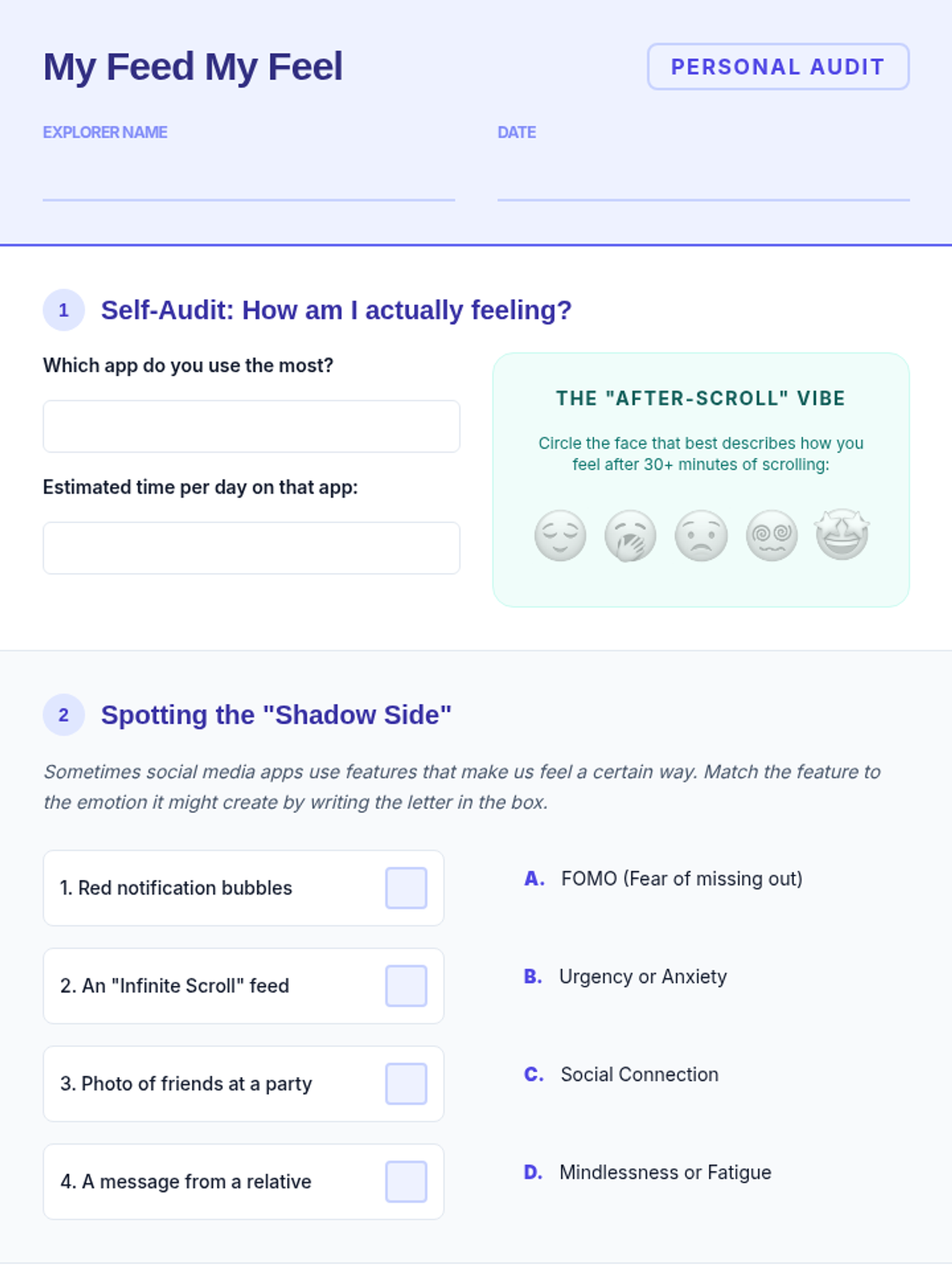 An individual reflection worksheet for 6th-grade students to analyze their social media usage, identify emotional triggers, and set personal digital boundaries.