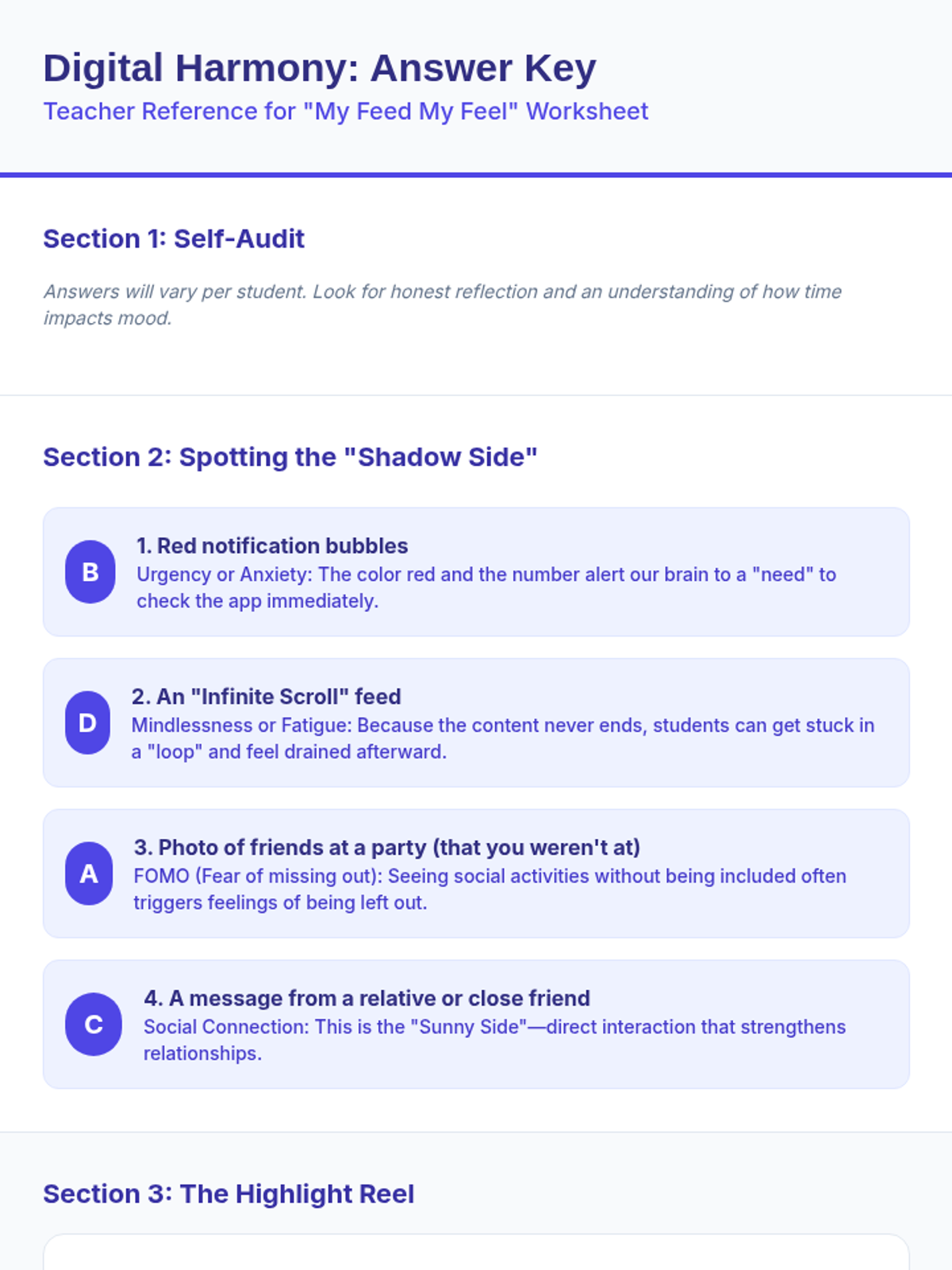 A teacher's answer key for the 'My Feed My Feel' worksheet, including sample answers and explanations for the emotional impacts of social media features.