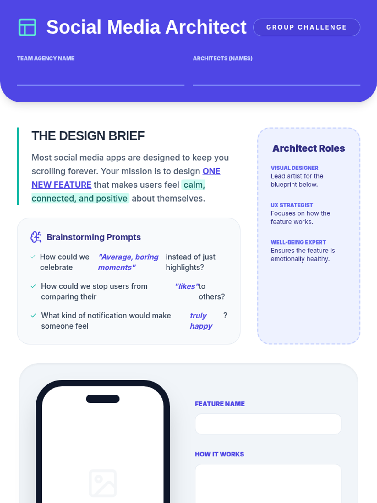 A group project guide for 6th-grade students to collaboratively design a social media feature that prioritizes user mental health and emotional well-being.