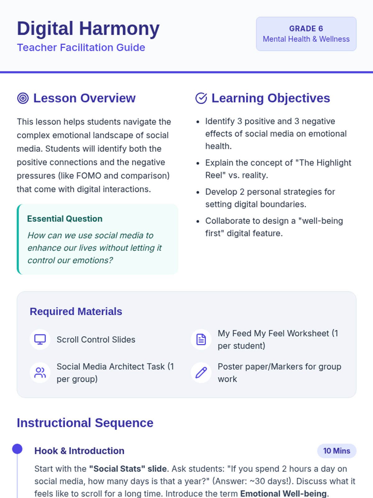 A detailed facilitation guide for teachers to lead a 6th-grade lesson on social media's impact on emotional well-being, including pacing, objectives, and instructional tips.